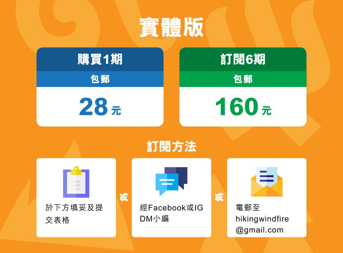 立即成為《風火山林》(雙月刊)訂閱戶!一書在手,享受每期精彩內容及豐富行山資訊。
