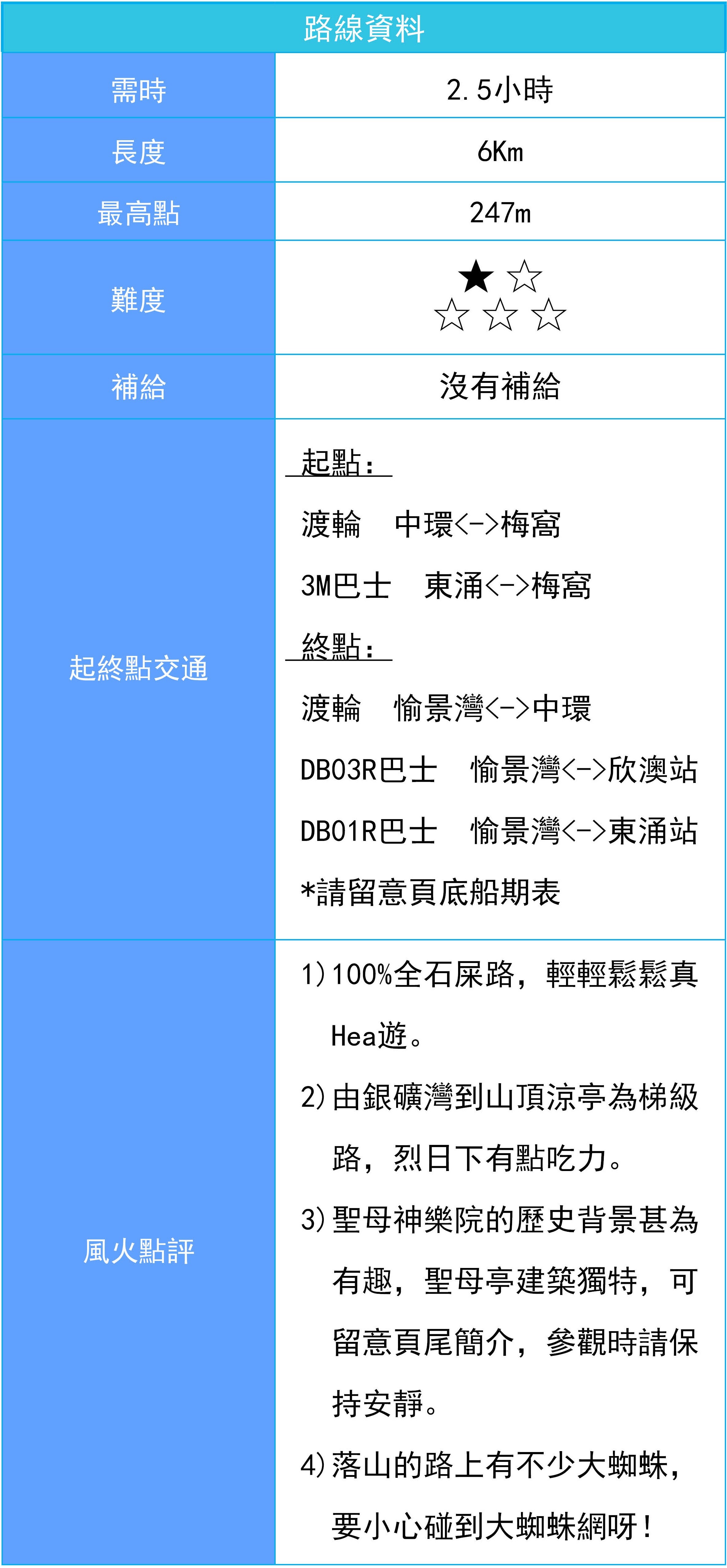 經驗過橫風橫雨的挑戰之後,今個星期終於可以輕輕鬆鬆真Hea遊。和新朋友一同於中環6號碼頭集合,前往梅窩,在梅窩買了點小食生果就向銀礦灣方向出發,在沙灘的盡頭有山路上山,全為梯級石屎路,一直上到山上的涼亭,在山上可以看到銀礦灣全景。大家在山上午餐休息,大量水果是今日的健康午餐。下山的方向可以望到九龍及香港島。一直下山到熙篤會神樂院,再沿海邊小路到達終點愉景灣,嘆個雪糕收隊。
