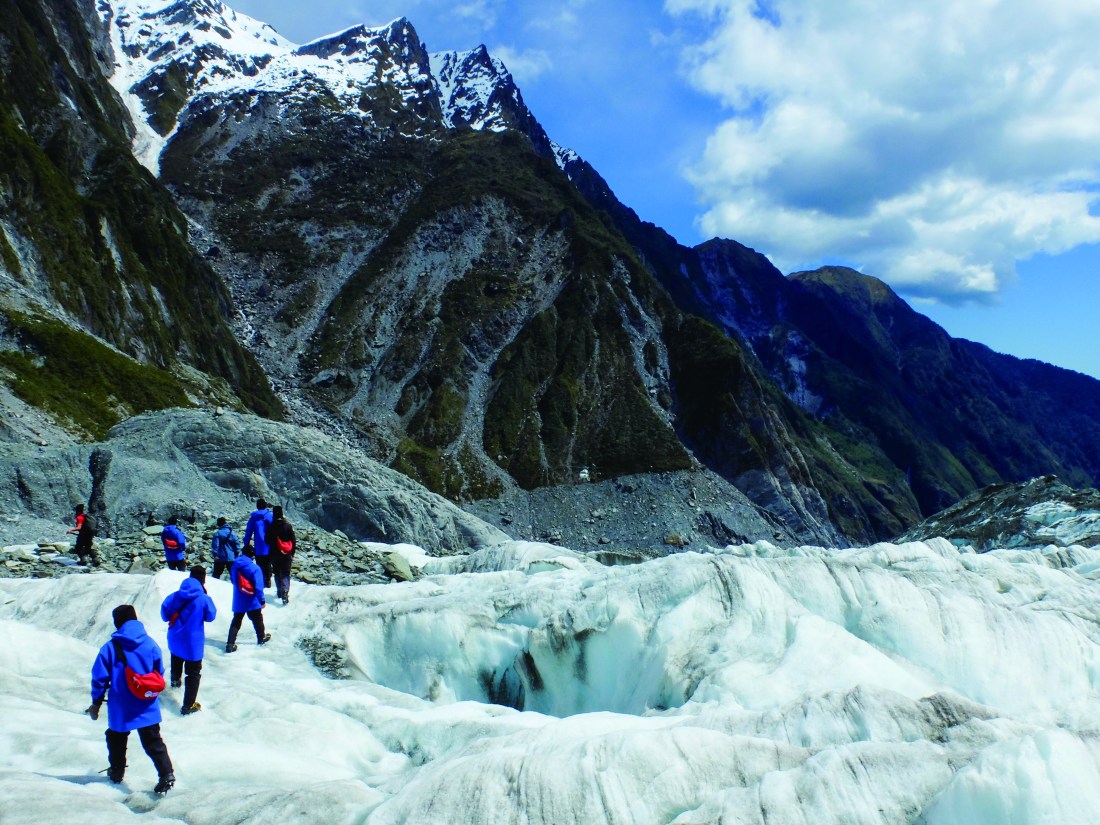 紐西蘭國內大大小小的冰河多達30個,法蘭茲約瑟夫冰河位 於被稱為「冰河之國」的南島西岸,仍是其中最受旅客歡迎的大型冰河。只要自備裝備及注意安全,任何人也能自行踏上冰河。筆者參加的冰河導賞團則包括冰爪、直升機接送及導遊解說,價值1,800港元。來自世界各地的大夥兒早上在小鎮上的旅行團櫃台集合,接過冰爪,換上雪衣及雪褲,便乘直昇機往冰河進發。不消十分鐘,便可從直昇機上看到冰河的景色,震撼得引來一陣哄動。