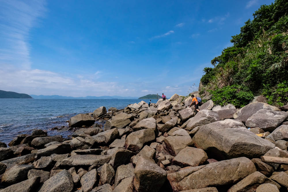 棺材角位於西貢灣仔半島北端,適逢烈日當空,棺材角綑邊之旅終於成行。久違了綑邊路線,今次來個簡單終極短綑。大家乘小巴到海下,不用半小時,就由海下走到灣仔營地。我們打算由小路爆落三抱石再綑到棺材角,但落三抱石的小路叢林太密,絲帶都冇條,人煙罕至,在密林之中喪爆一輪後,終於來到三抱石的隱世草地大休。之後沿海岸綑至棺材角,岸邊佈滿方形大石,形似棺材。綑邊路線不長,加上沒有險位,不算難行,只是暑氣逼人,比較辛苦。由陡峭小路上攀回山頂,接回原路回到海下嘆可樂。玩到損手爛腳,一星綑邊,五星爆林,癲到盡。