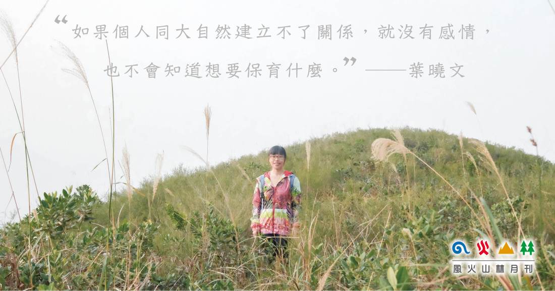 畢業於中文系的葉曉文,一直是個說故事的人,她憑短篇小說《殺寇》獲得青年文學獎,現計劃再寫一本自然小說,認為故事可帶來更多反思空間。她的得獎作品《殺寇》寫漫畫家在理想與現實間掙扎,文風灰暗。她說自小到大都較內向,「以前真的不出聲,最好讓我待在角落。」讀書時做五分鐘演講已令她叫苦連天,現在卻要被訪問、辦講座、帶導賞。「哈哈,我都估唔到有咁嘅一日。」因着《尋花》,她由書房走到戶外,將視點由自身轉到植物及動物,眼界擴闊,山野使她變得開朗,現在她為大家介紹動植物時從容自在,她的老師更戲稱她是大自然的「Agent」。「其實愛護大自然及保護大自然是很空泛的話。如果個人同大自然建立不了關係,就沒有感情,也不會知道想要保育什麼。」所以她寫作、畫畫、帶導賞,就是希望公眾知道她愛護的大自然有什麼「正嘢」、「得意嘢」,不是僅僅流於打卡,空叫「保護大自然」的口號,而是產生感情,建立關係,才會真心愛護大自然。