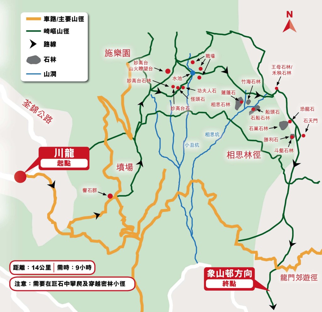 除了友人的地圖之外,我們還參考了《知情識趣遊香港5》內的文章《縱走七重岩》,由川龍出發,經響石墳場沿響石脊上妙高台。響石墳場因此地有響石而聞名,以小石塊敲打響石,鏗然有聲。經過墳場的時候,我們先找一找響石。原來一點都不難找到,在路旁就已經有指示牌,在響石旁邊更有說明介紹牌。我們嘗試敲打響石,發現不算太響亮,與柏架山天音響石的清爽噹噹聲相比,真的相差甚遠。找過了響石,我們就繼續上行,穿過墳場,繼續沿響石脊上妙高台。