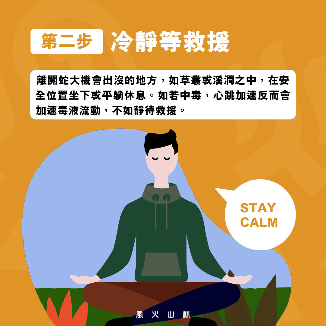 第二步:冷靜等救援 最重要保持冷靜,遇到危險立即求救,和致電999盡快尋求醫療援助。此時應和蛇保持距離,以避免再次被咬,離開蛇大機會出沒的地方,如草叢或溪澗之中,在安全位置坐下或平躺休息,等候救援,亦應避免過份緊張或郁動,引致心跳加速,令毒素在體內運行得更快。要注意避免飲用含有咖啡因或酒精的飲品,以免加快毒液吸收。