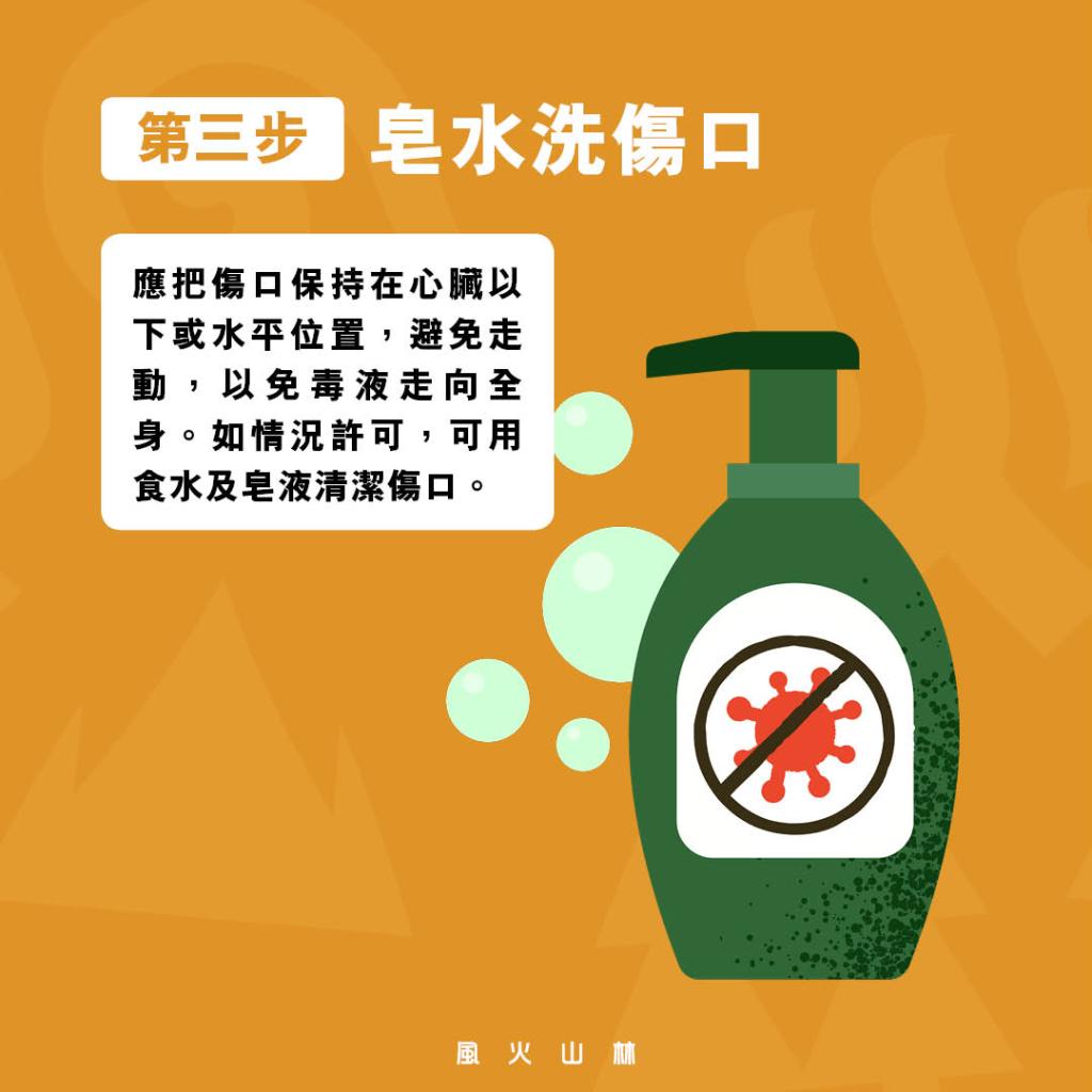 第三步:皂水洗傷口 切忌緊紮傷口,以保持正常血液循環,應把傷口保持在心臟以下或水平位置,避免走動,以免毒液走向全身。如情況許可,可用食水及皂液清潔傷口。