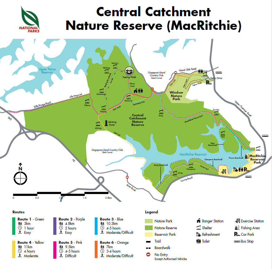 筆者今次為⼤家介紹⼀條全長約13公⾥、位於Central Catchment Nature Reserve的⾃然徑,總爬升只有約214 ⽶,屬合家歡路線。Central Catchment Nature Reserve是新加坡最⼤的⾃然保護區,佔地3,043公頃,其中⼀部份由國家最古老⽔塘MacRitchie Reservoir組成,⽽⾃然徑為半環⽔塘路線,山明⽔秀,風光明媚。