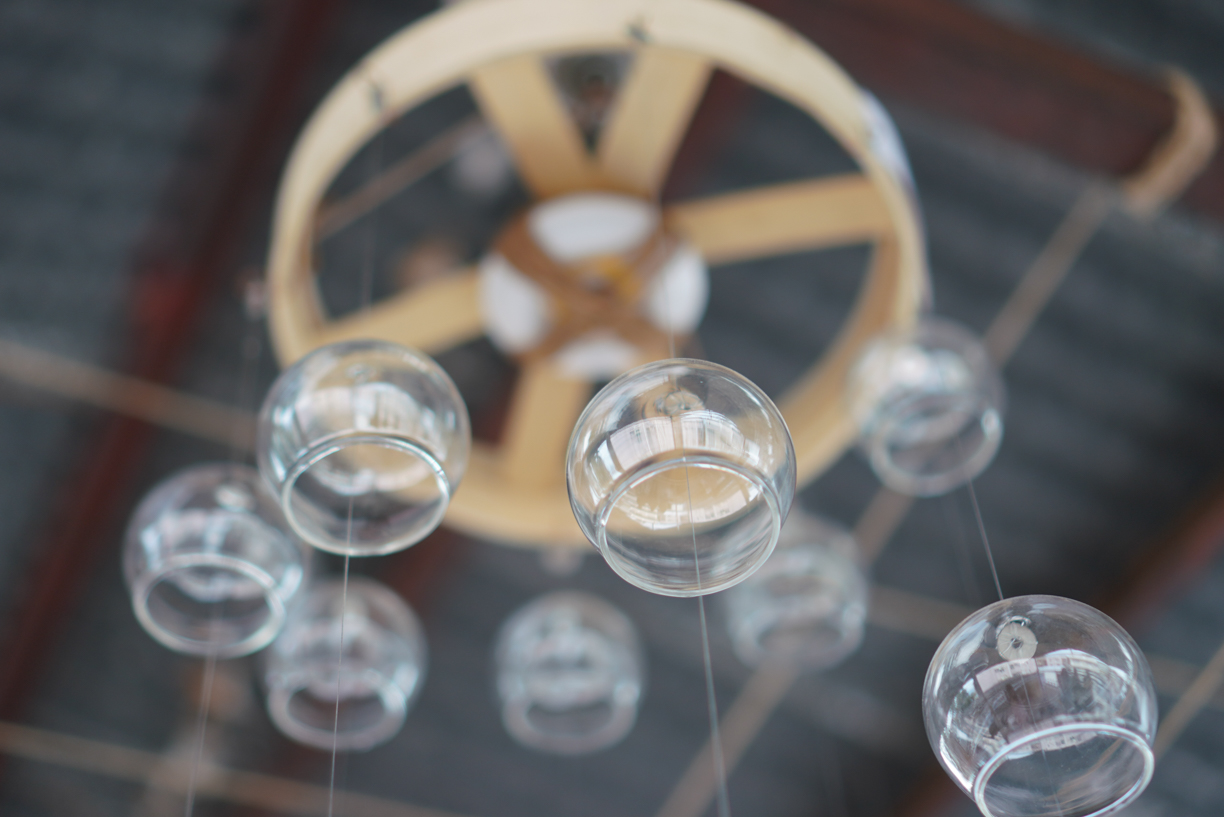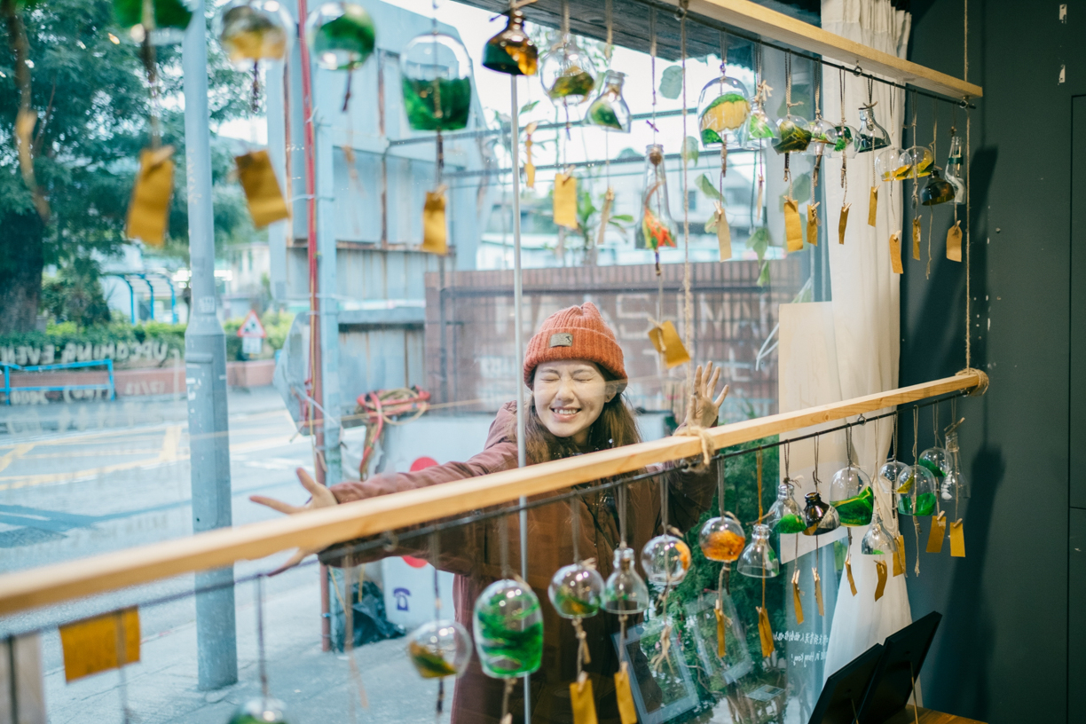 「到底應不應該拉上布簾?」山系風鈴展最奪目的41個以香港山峰為主題的風鈴,就放在門口旁邊的櫥窗位置,文西為了要不要拉上櫥窗的布簾而糾結,但最後都決定讓窗外的風景融入作品,讓大自然的光照射在玻璃風鈴之上。玻璃風鈴的特別之處,就是透明的背景,例如獅子山的風鈴上,天空是透明的,你可以為獅子山配上不同的真正天空——晴朗的藍天又或是陰雨的冬日,山系風鈴的背景就會因自然天氣而轉變,令作品有無窮變化。除了以透明來表達背景的天空,文西亦以玻璃的透明,來表達千島湖的水,獅子山和千島湖都是她十分喜歡的作品。