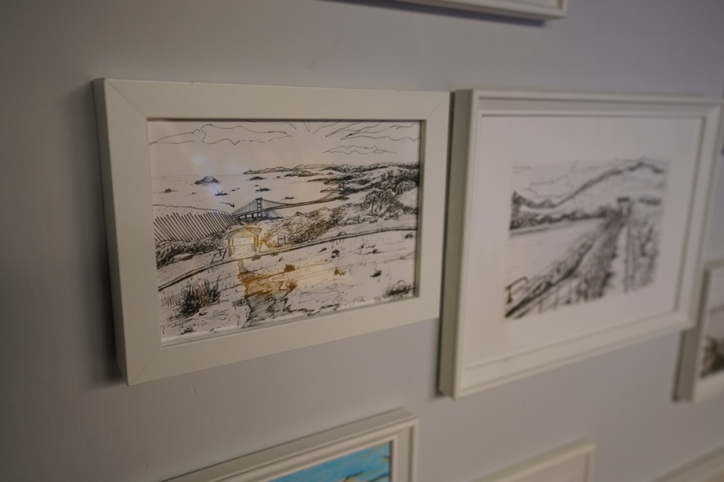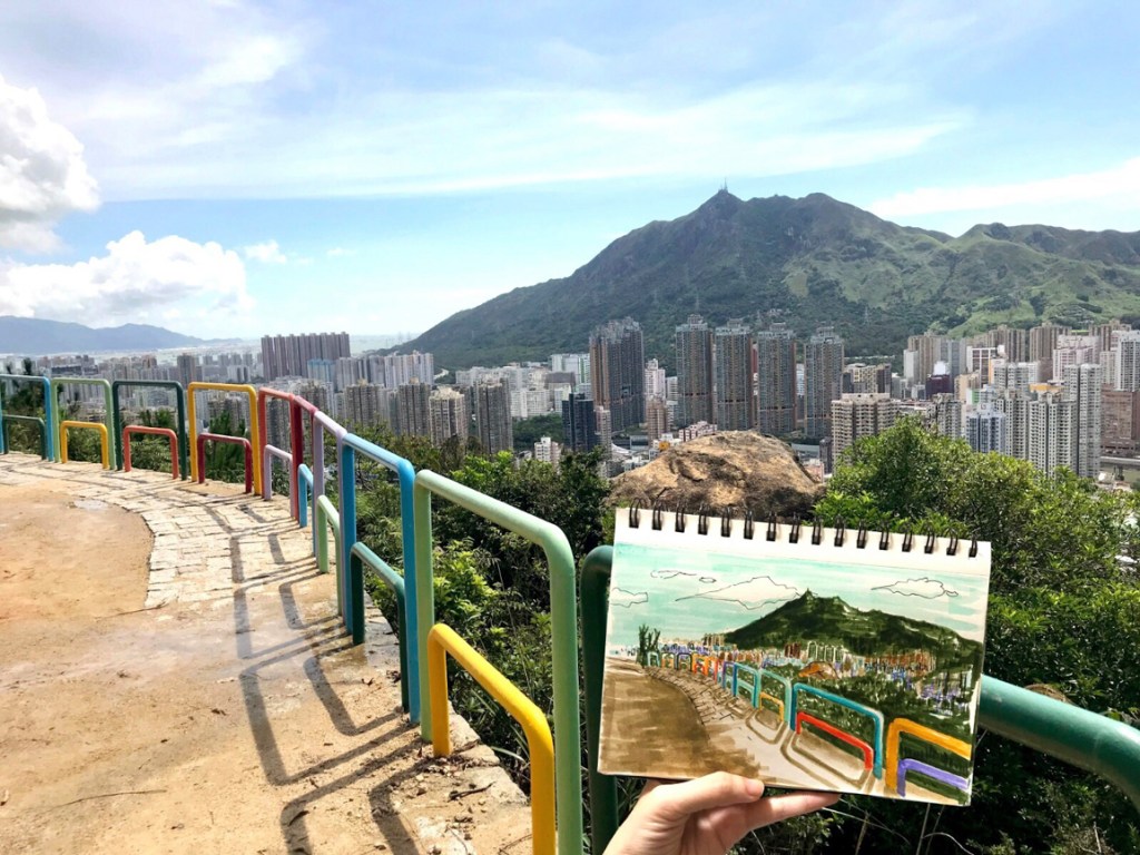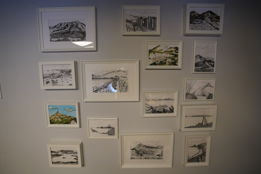 今次展覽選擇在錦田的迴響Homecoming舉行,迴響Homecoming集多重身份於一身,不但售賣文創作品、手工啤酒、書及茶葉等,亦是工作坊及音樂表演的場地。展覽分為三層,第一層就在門口旁邊的櫥窗,陳列了四十一個以山為主題的風鈴;第二層展示的是文西的畫作,一共有31幅在香港行山的寫生作品;第三層則是要爬鐵梯才能夠上去的天台,擺放名為「風鈴輪流轉」的裝置作品,還有更多風鈴。也許大家都被山系風鈴吸引,寫生作品就相對變得「普通」。但文西強調,這一層的作品對她來說是最為重要,因為一切的起點,都是由她行山寫生開始,如果她沒有開始寫生,亦不會有造風鈴的想法,也不會有這個展覽。她還建議山友們,行山的時候可以嘗試寫生,不用太多工具,也不用介意畫得好不好。文西一般只是用一支針筆畫黑白的寫生作品,有時會用水彩加上顏色。如果打算寫生的話,她會選擇較易到達的山徑,預留多一小時左右來作畫。她覺得作品畫得好不好是其次,寫生主要是用來紀錄。「好多人覺得畫畫一定要靚,我覺得呢個Concept係錯。我覺得Sketching係為了紀錄,可以好快咁完成。」不少人都會因為覺得畫不好而害怕寫生,文西卻覺得不論能力,人人都可以將自己喜歡的東西紀錄下來。