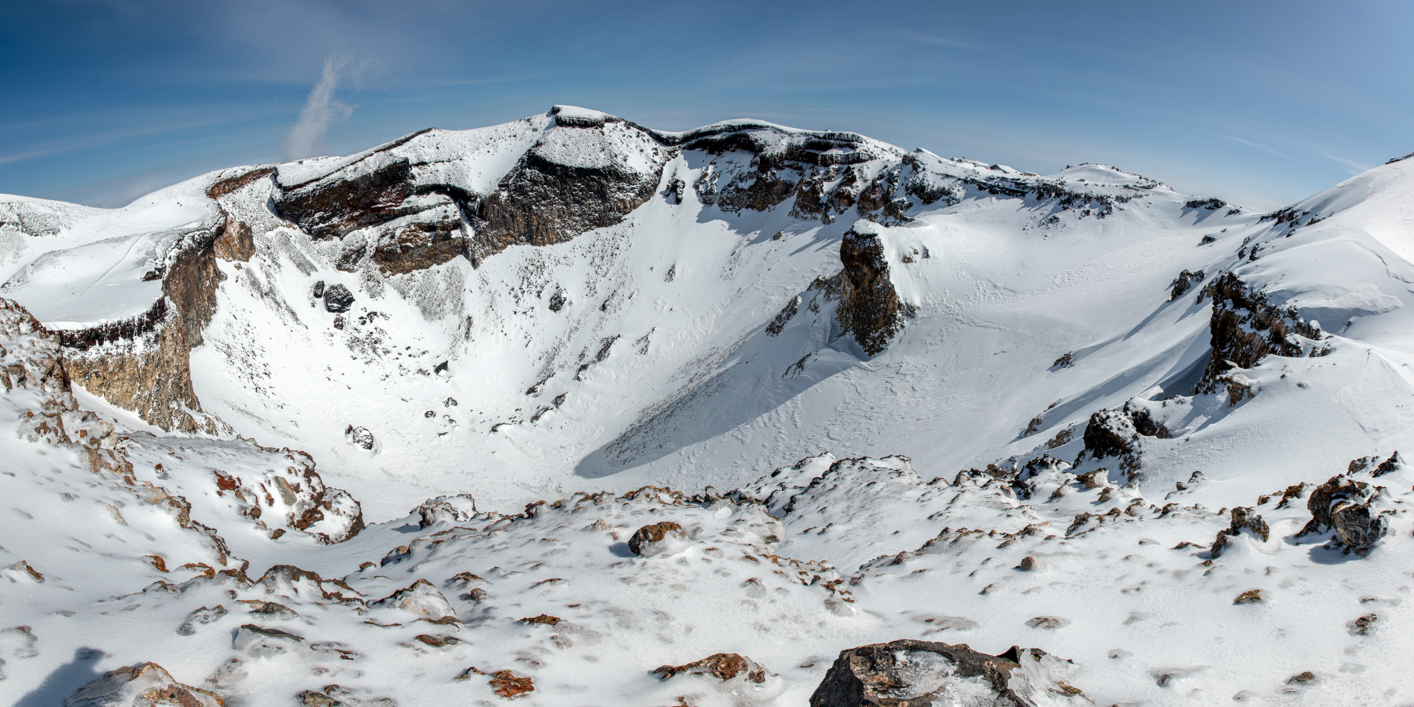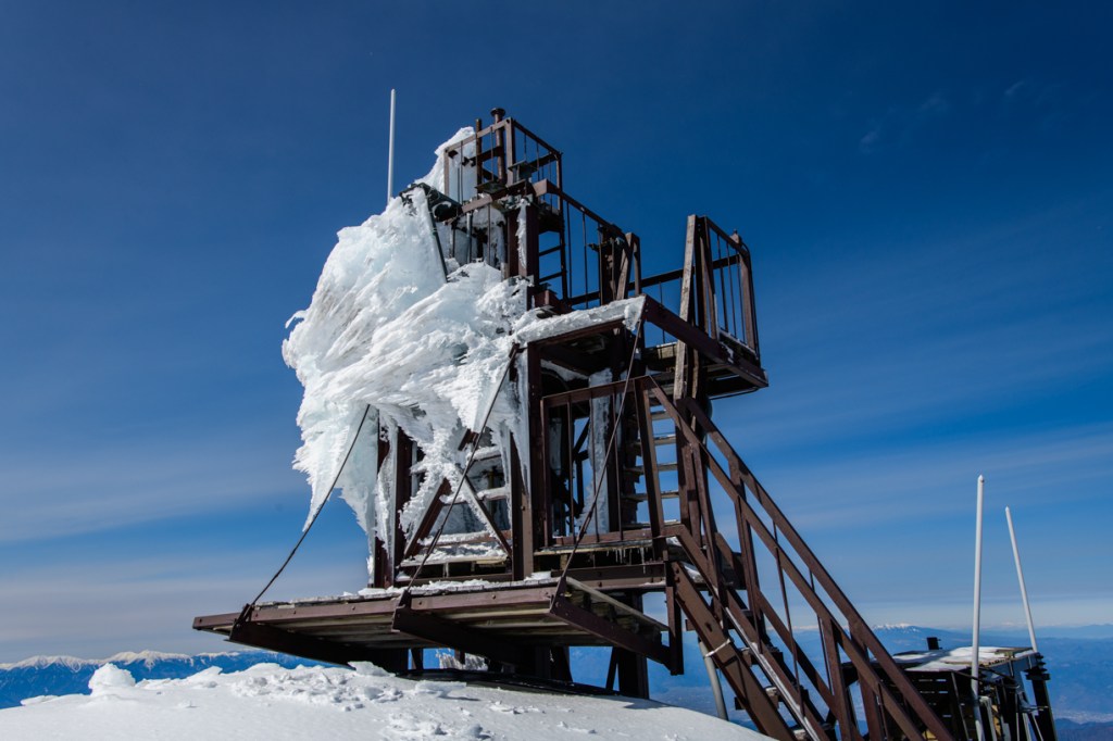 12時30分我終於抵達頂上奧宮,我進食了半條能量棒,短暫休息後,又開始繼續行程,繞行火山口一圈。這條繞行一周的路線,正式官方名稱為缽巡,其實是將富士山火山口比作碗口,在碗口巡遊。缽巡的路線被冰雪覆蓋,只能依靠目測,離頂上奧宮不遠的朝日岳登上去,才發現另一端需要下攀,若技巧不好,則需返回一段從側邊繞過。經過10分鐘左右起伏的路段來到頂山富士館,山頂郵便局也在此處,不知若現在投下明信片,開山的時候會否寄出。前方的山頂有一座建築物,是全日本最高的氣象觀測所,漫畫《孤高之人》中的主角森文太郎,曾經有一段時間在這裏工作,觀測降雪數據。觀測台的冰柱幾乎呈現水平狀態,可見該處風力強勁。劍峰的石碑也在觀測台邊上,我與它合照後便繼續完成餘下一半的缽巡。回到頂上奧宮,能眺望遠處的穗高岳群峰,回想起3年前,我也從奧穗高岳眺望富士山。