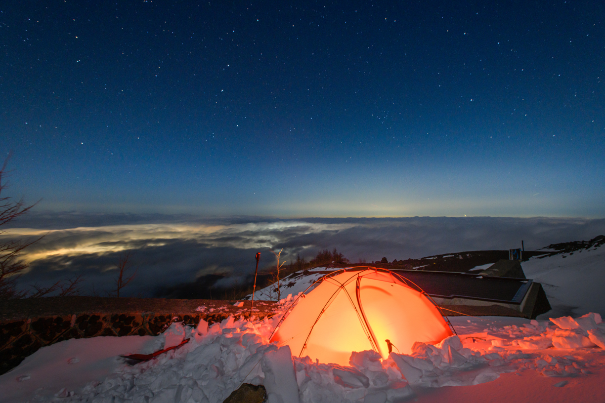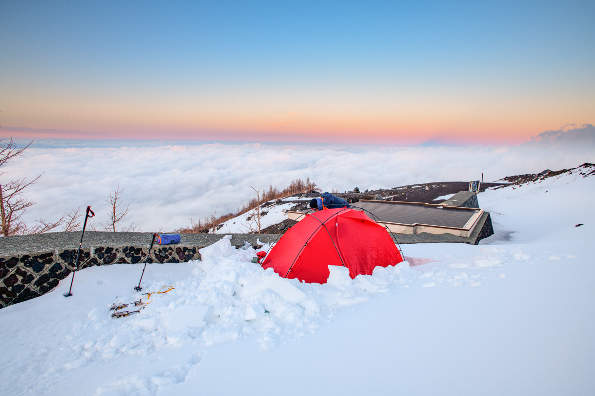 我本想在佐藤小屋隔壁的空地上紮營,考慮到時間尚早和景觀一般,便前往六合目尋找合適的紮營位。從五合目到六合目花了點時間,最後5點前,在六合目一個景觀不錯的墩台上搭建帳篷,景觀不錯意味搭建的位置有一定暴露程度,搭建帳篷需要更加注意防風。我一口氣吃了兩包乾燥飯和一包乾燥粥,胃口異常地好,畢竟一整天都在趕路,只吃了一根能量棒,沒有進食其他固體食物。室外氣溫應該已經是零下十度,躲在睡袋中還能用WhatsApp通話與女友報平安。上了五合目之後,能直接看到河口湖及吉田市,手機訊號接受良好,能順暢瀏覽YouTube和其他網站。帳篷外寒風呼嘯,我忽睡忽醒,感覺過了很久,原來只睡了兩小時,還未到凌晨1點。