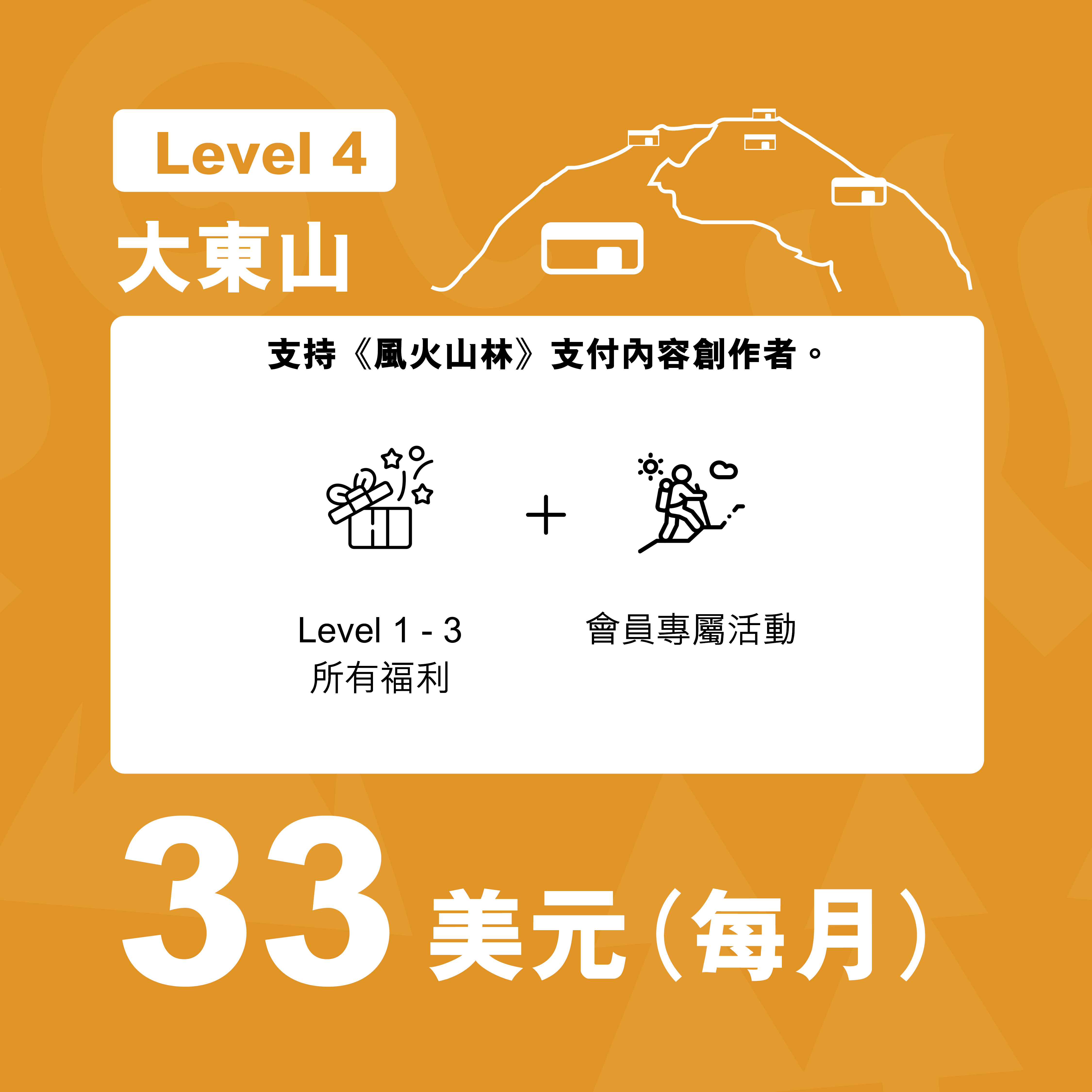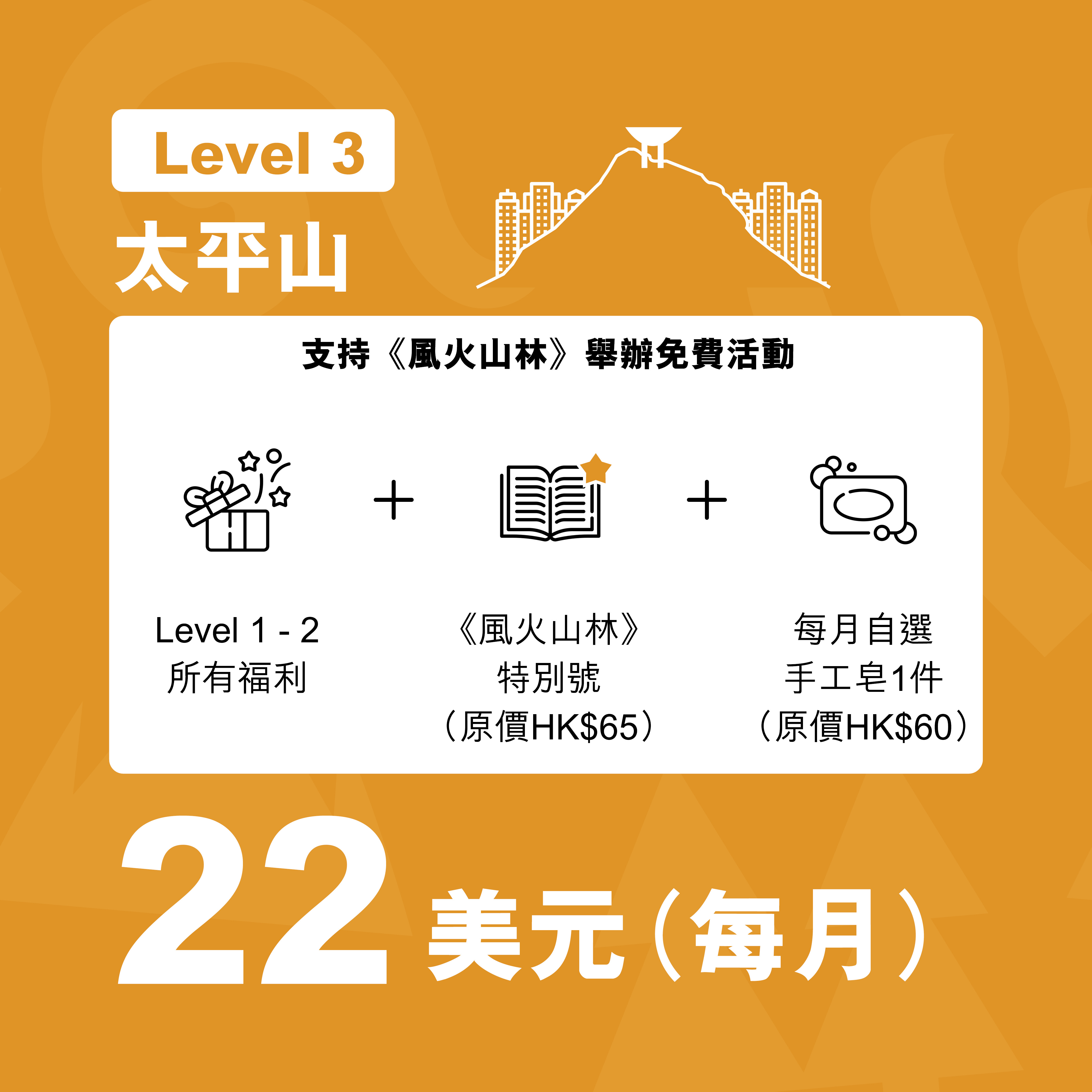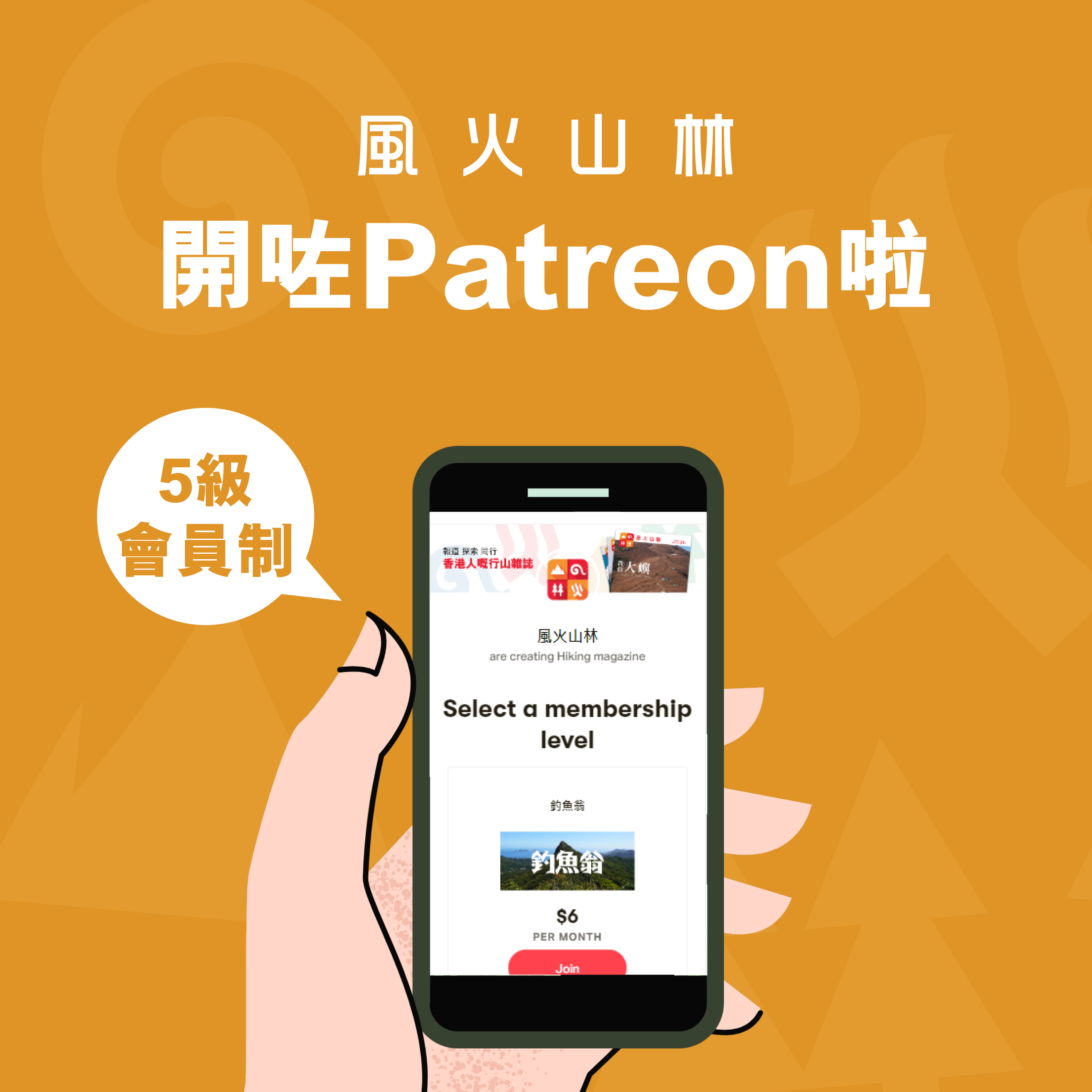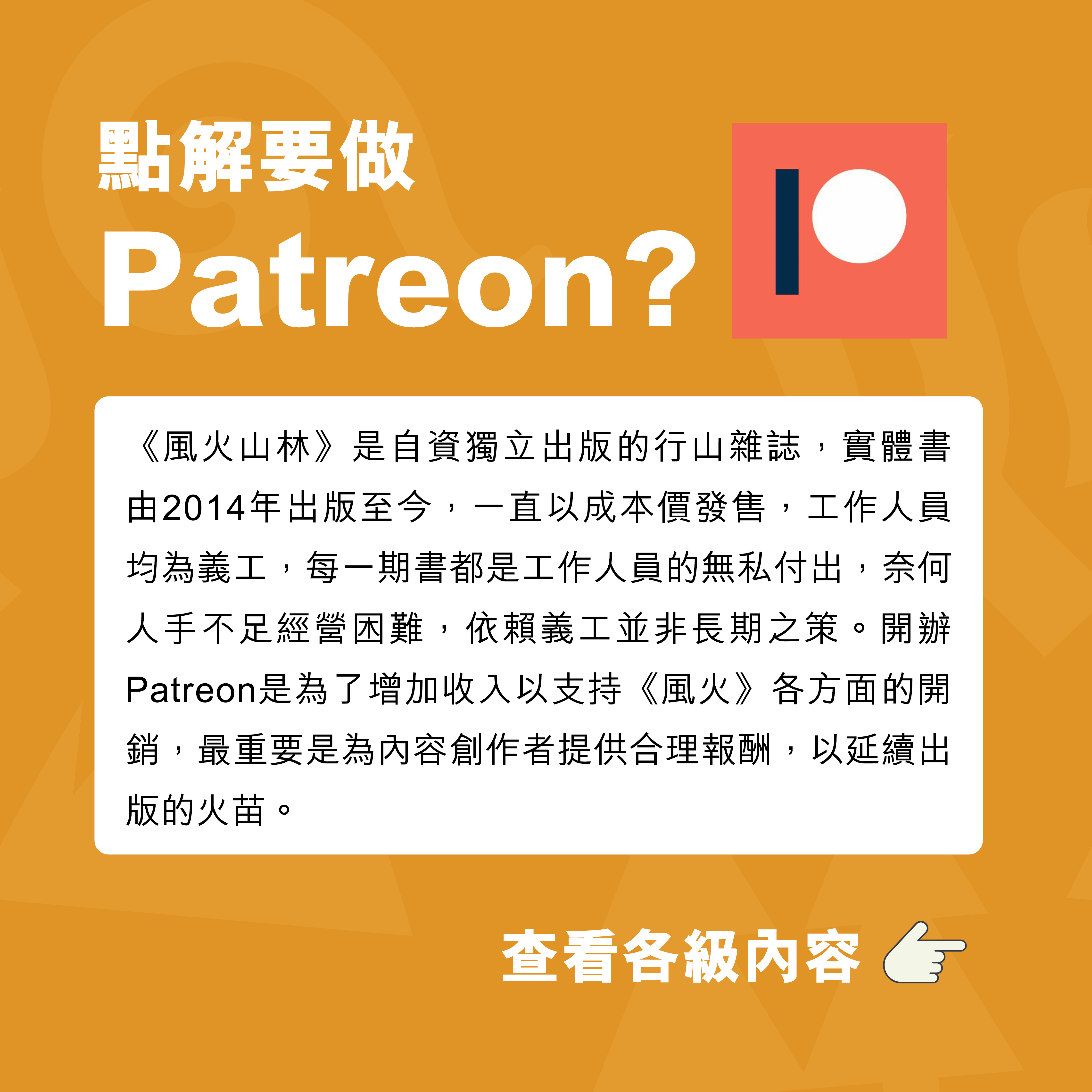 點解要搞Patreon?《風火山林》是自資獨立出版的行山雜誌,實體書由2014年出版至今,一直以成本價發售,工作人員均為義工,每一期書都是工作人員的無私付出,奈何人手不足經營困難,依賴義工並非長期之策。開辦Patreon為了增加收入以支持《風火》各方面的開銷,最重要的是為內容創作者提供合理報酬,以延續出版的火苗。
