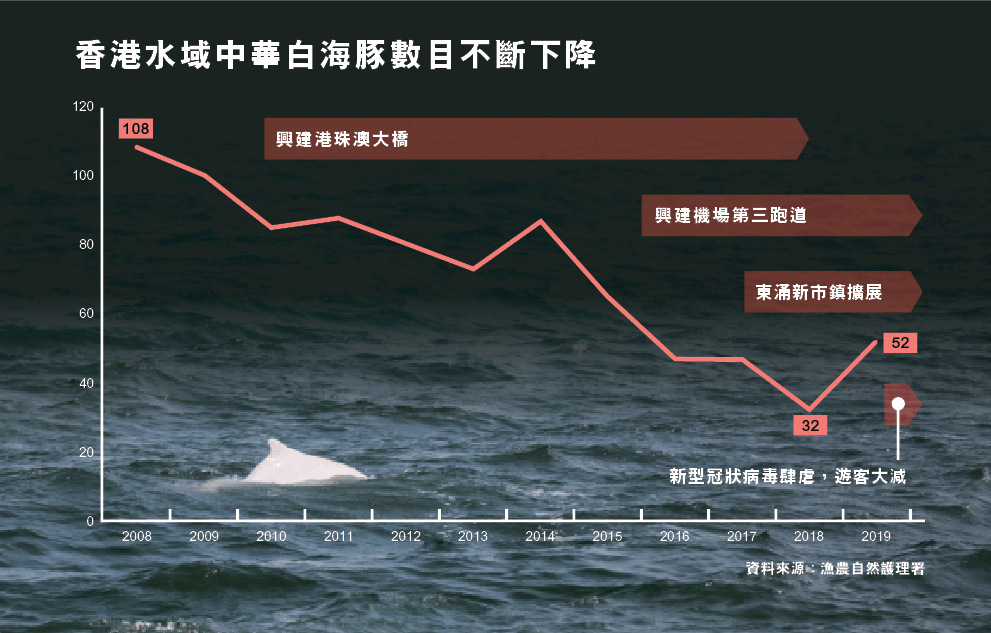 海豚的死去不是個別例子,在香港水域活躍的中華白海豚由回歸當年的250多條,跌到現在只剩數十條。彷似是命運的安排,出生於1996年的Daphne,畢業作品是見證回歸吉祥物命途多舛。「我拍紀錄片前,香港的水域有60多條,我拍的那年只餘47條。但2003年有紀錄約180條,未建機場前更多,由180條去到47條都幾誇張,堂堂回歸吉祥物就淪落至此。」中華白海豚要面對海上交通繁忙、污染及發展工程的威脅,生存環境嚴峻。