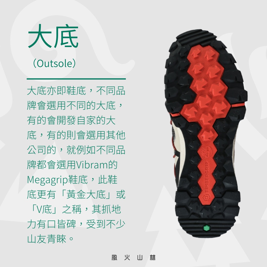 大底亦即鞋底,不同品牌會選用不同的大底,有的會開發自家的大底,有的則會選用其他公司的,就例如不同品牌都會選用Vibram的Megagrip鞋底,此鞋底更有「黃金大底」或「V底」之稱,其抓地力有口皆碑,受到不少山友青睞。