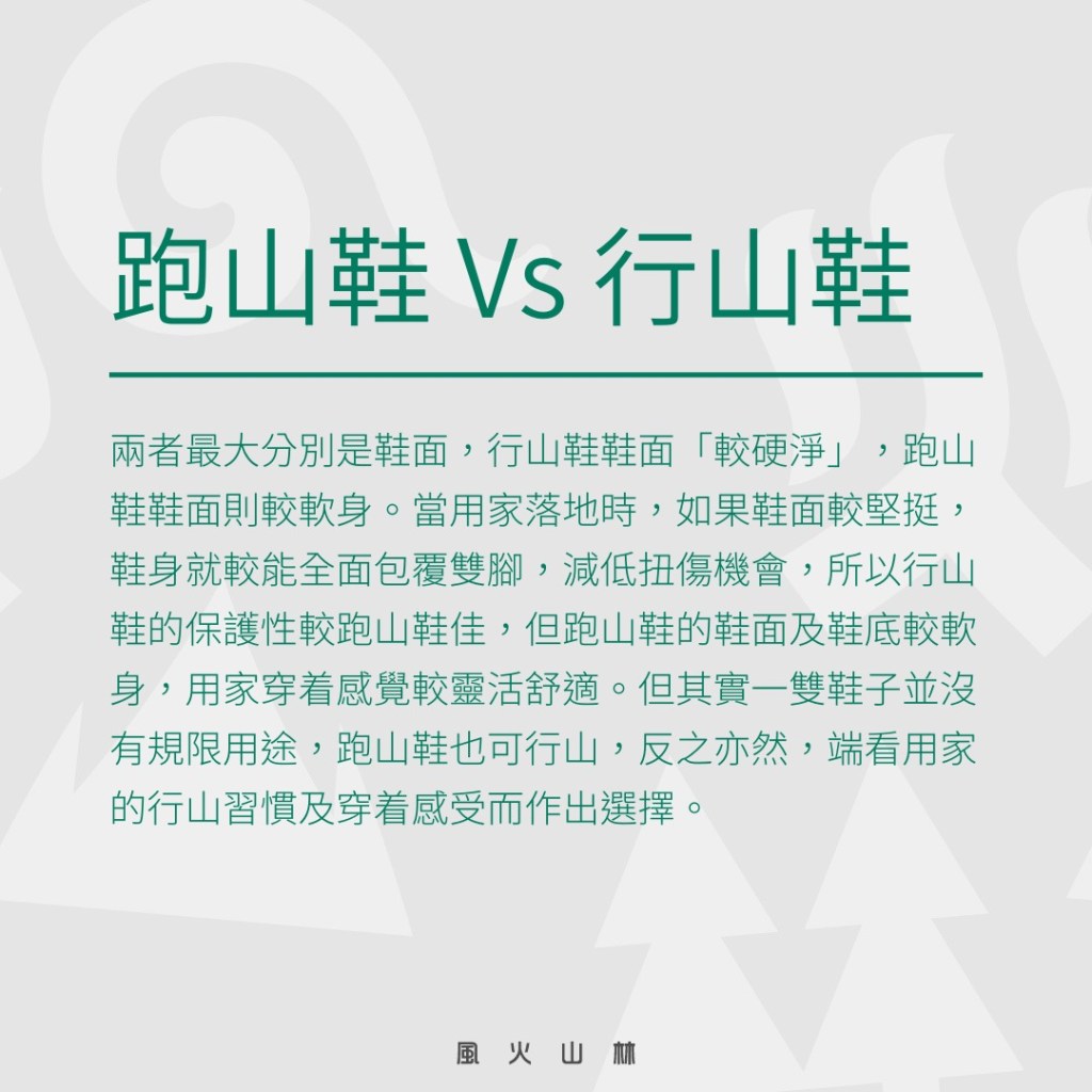 兩者最大分別是鞋面,行山鞋鞋面「較硬淨」,跑山鞋鞋面則較軟身。當用家落地時,如果鞋面較堅挺,鞋身就較能全面包覆雙腳,減低扭傷機會,所以行山鞋的保護性較跑山鞋佳,但跑山鞋的鞋面及鞋底較軟身,用家穿着感覺較靈活舒適。但其實一雙鞋子並沒有規限用途,跑山鞋也可行山,反之亦然,端看用家的行山習慣及穿着感受而作出選擇。