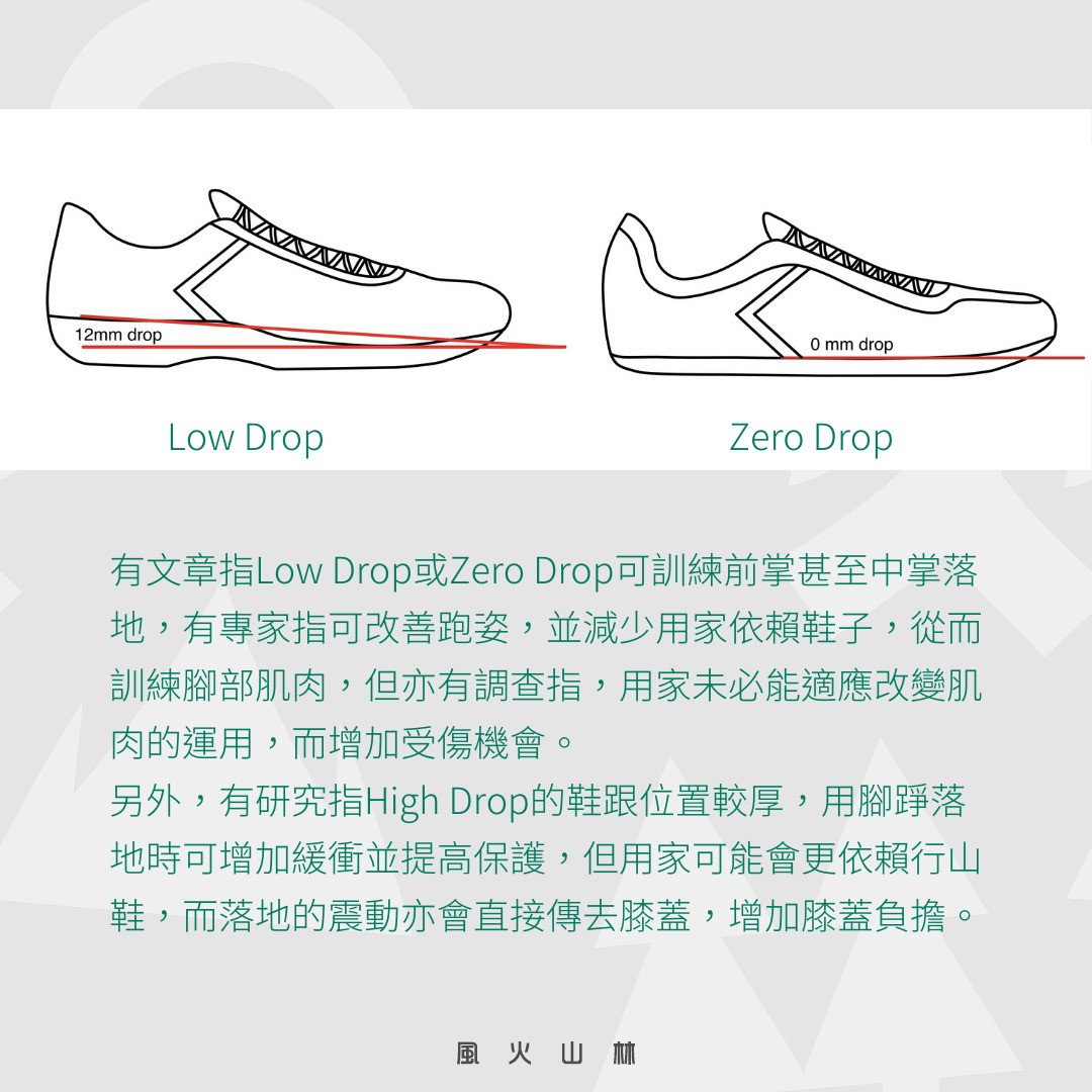 即鞋前掌和鞋跟高度的差距,差距大的稱為High Drop,概念近似高跟鞋,差距小的則稱為Low Drop,如前掌及鞋跟的高度一樣,則是Zero Drop。有文章指Low Drop或Zero Drop可訓練前掌甚至中掌落地,有專家指可改善跑姿,並減少用家依賴鞋子,從而訓練腳部肌肉,但亦有調查指,用家未必能適應改變肌肉的運用,而增加受傷機會。另外,有研究指High Drop的鞋跟位置較厚,用腳踭落地時可增加緩衝並提高保護,但用家可能會更依賴行山鞋,而落地的震動亦會直接傳去膝蓋,增加膝蓋負擔。