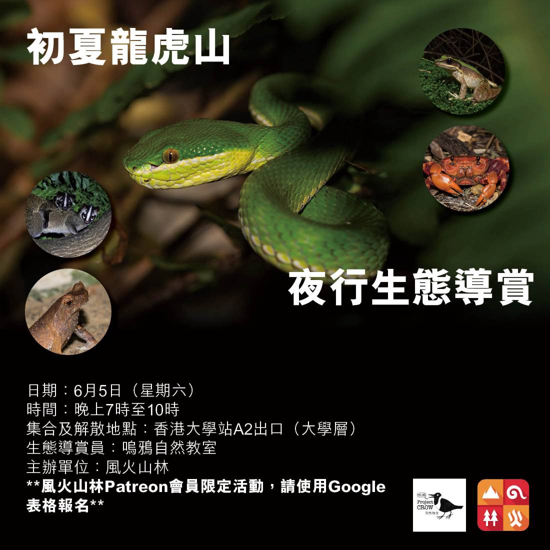 夏日炎炎行山真係好辛苦,但夜行就唔同了,但係黑媽媽係個山度有咩野睇?原來夜行可以睇到好多動物!今次風火山林邀請了嗚鴉自然教室的兩位導賞員,帶大家到香港島西面的龍虎山夜行。龍虎山有豐富的天然生態資源,夜行的過程中大家有機會見到不同的夜行動物,例如:果子狸、蛇、飛蛾、蛙及蜘蛛等。在導賞員的帶領下,了解繁華都市旁的生態。是次活動為風火山林Patreon會員專享活動,只限會員及其親友參加,名額為10人。是次活動由最少2名導賞員及2名工作人員帶領,以便妥善照顧參加者及在有需要下分組活動。