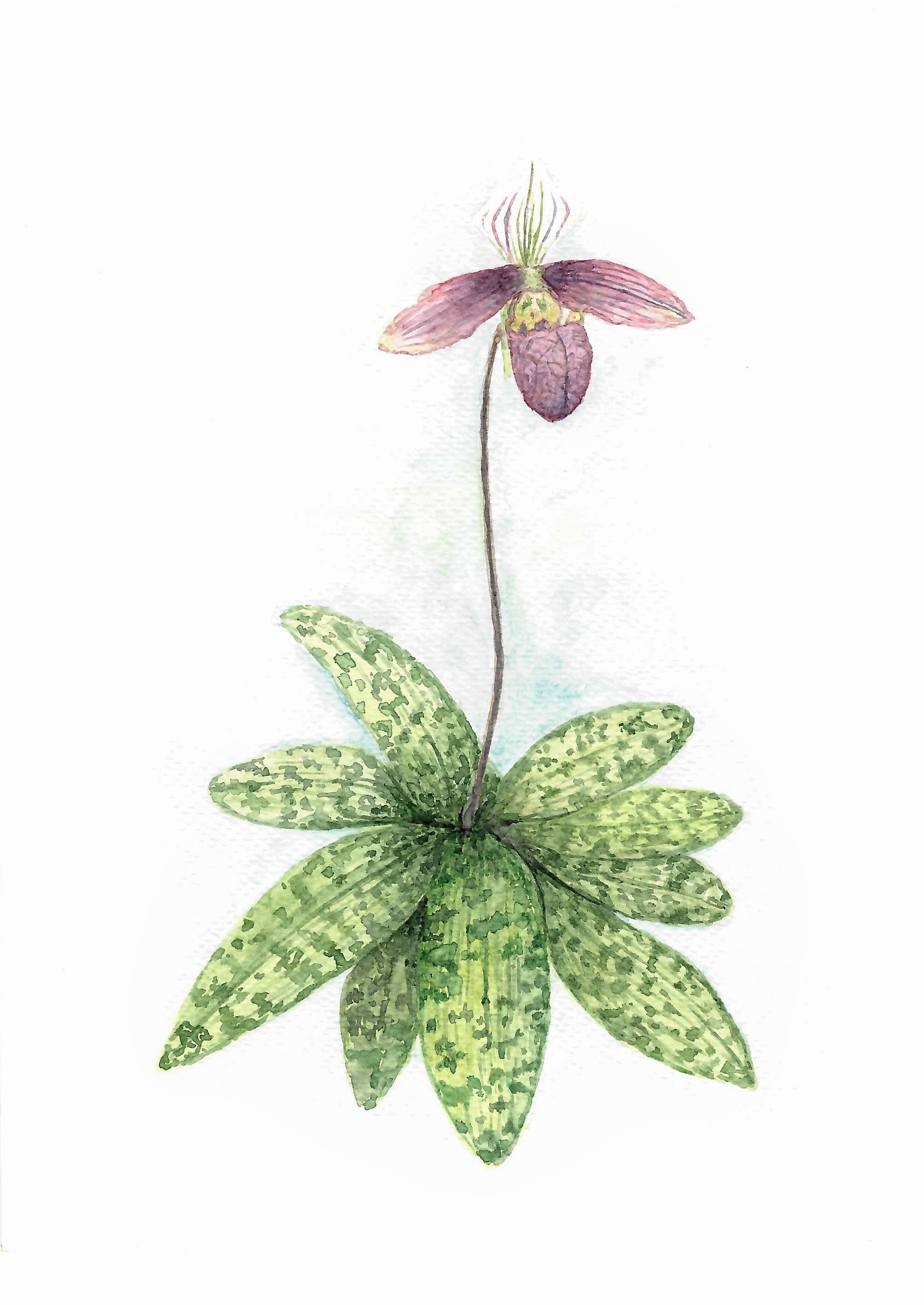 一行四人繼續四處尋覓花蹤,未幾他們便傳來好消息。山坡上一株植物近基部散出數片斑駁的葉子,墨綠網斑分明相間,頂生的一朵花蕾垂頭待放,正是一直尋找的紫紋兜蘭!
