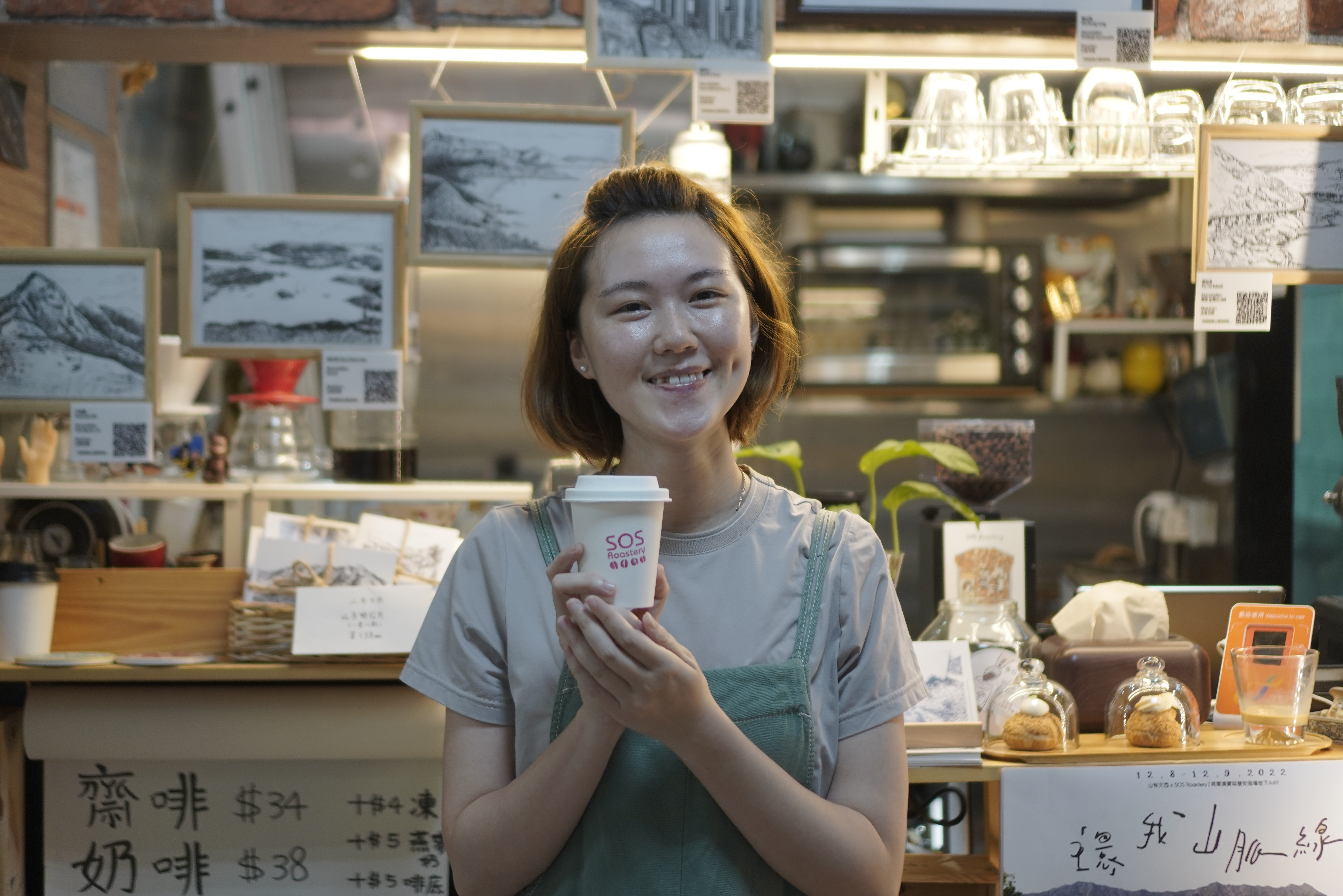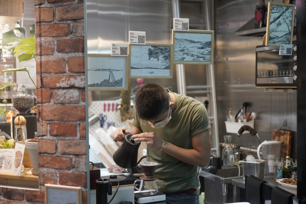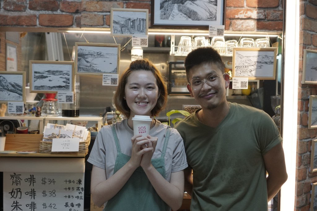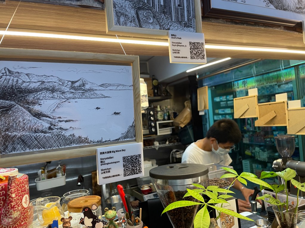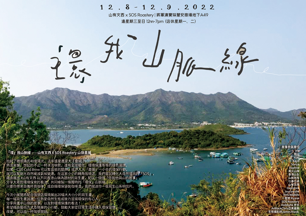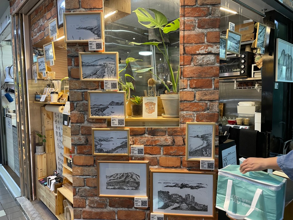 畫展選址寶林的咖啡店SOS Roastery,山友看畫之餘,也可嘆杯咖啡。其實咖啡店僅佔商場一隅,老闆阿Mo願意分享這小小地方,實在非常難得,而文西也靈活善用空間,用畫作拼成一道山脈線,環抱小店。除了環抱,文西更想的是環保,也是今次展覽點題之處,希望上山的人享受山林的同時,也盡力環保,好好保護山林,回饋大自然給予我們的治癒。如你自攜杯買咖啡,或自備環保袋裝咖啡渣,文西就會送出一張寫生作品明信片,以獎勵愛山的人。