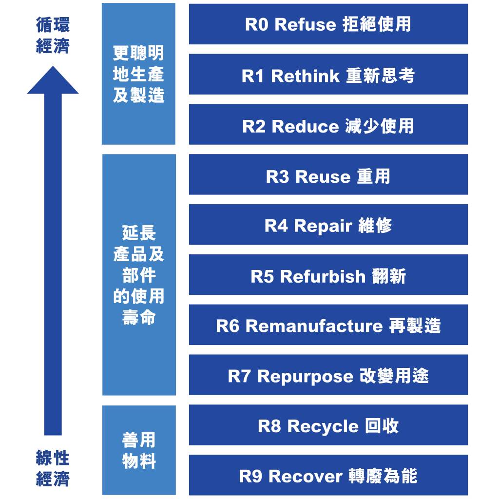 傳統經濟模式都離不開:開發資源、生產、銷售、使用、拋棄,這個線性模式消耗大量資源,同時製造大量垃圾。有見及此,人們提出了循環經濟。利用大家耳熟能詳的「環保3R」: Reduce(減少使用)、Reuse(重用)及Recycle(回收),藉此減少資源消耗及廢物。及後「環保3R」發展成更多更多的「R」,體現循環經濟的更多可能性。最理想狀態的循環經濟,應該可以達至「零廢物」,因為資源可不斷被循環使用,或以極少資源滿足人的需求。我們手上有很多個R工具,但這些R看似環保,但它們並不是同等的,例如:「拒絕使用」是最理想的方法,然後才是「減用」、「重用」,更往後才是「收回」、「拋棄」。近年政府大搞回收項目,其實回收只算是低級環保,應更優先考慮的是「減用」和「重用」。這是大部分政府推行環保政策時所面對的問題,最易做的是回收,但最應該做的是「拒絕使用」及「減用」。可是「拒絕使用」和「減用」這類隱性的環保行動,往往得不到人們關注,「又冇得打卡呃Like」。