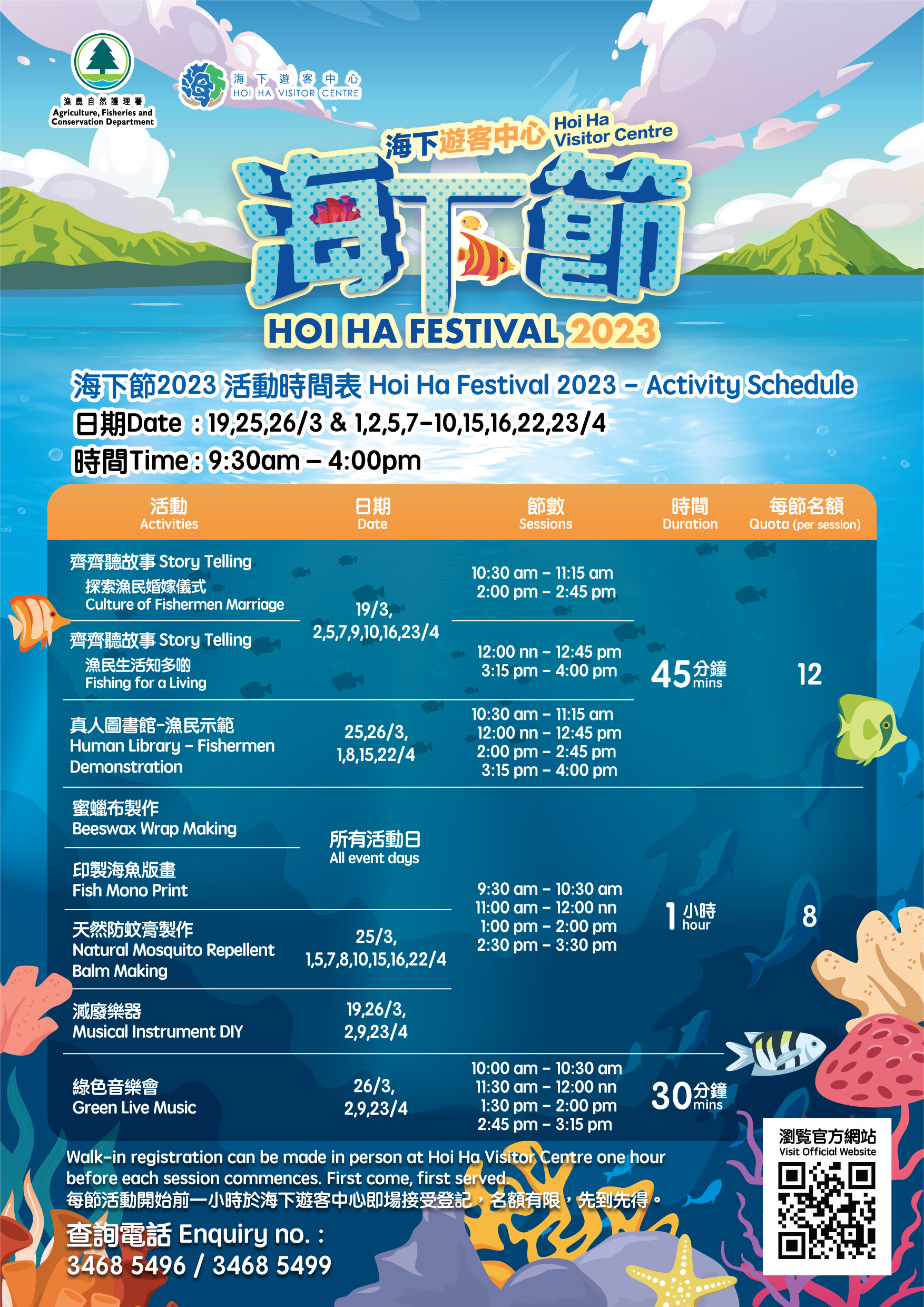 今年的海下節將於3月19日至4月23日期間的週末及公眾假期在海下遊客中心舉行,屆時會舉行多個公眾活動、工作坊及音樂會,讓大家了解海洋生態之餘,還可以「魚」民同樂。海下遊客中心於2021年才開幕,相信不少山友都還未去過。中心充滿文青風的木質設計建築及迴廊,加上清幽庭院設計,不但是郊遊打卡的好去處,還令人有與自然合一的感覺。在海下節期間,將舉行多場公眾活動、工作坊及音樂日,可讓大家透過藝術及音樂了解漁民生活、海洋保育及環保訊息,詳情可參考活動時間表。