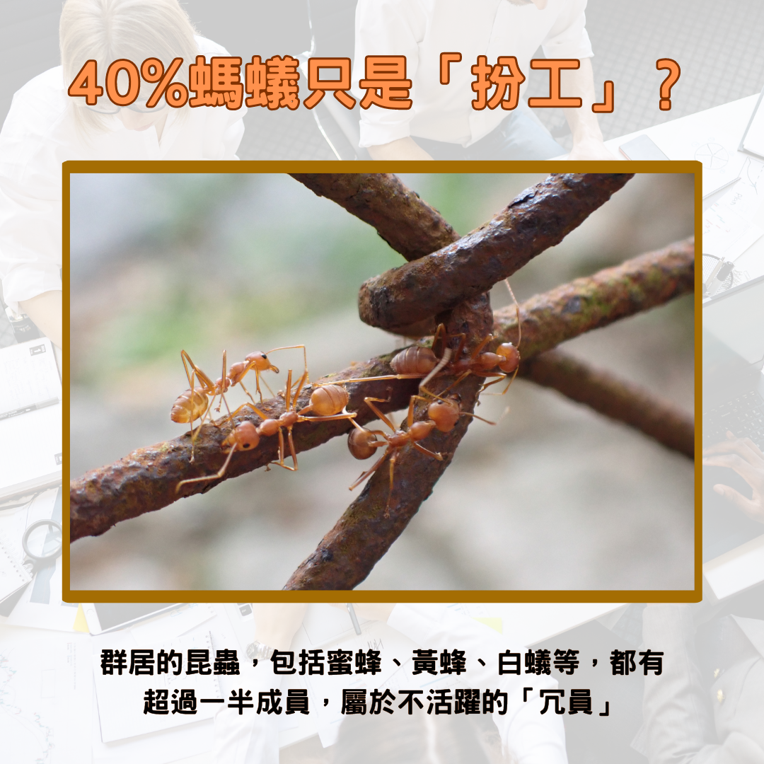 相信大家都聽過一個講法,就係有40%嘅螞蟻都只係「扮工」,睇落好忙,其實係冇嘢做。但就有研究指,呢啲「冗員」其實並唔係冇嘢做,佢哋只係作為後備嘅勞動力,如果工作量突然增加,或者需要補充勞動力嘅時候,佢哋就會挺身而出,維持整個族群嘅工作表現。其實各位打工仔都明白,每個崗位都需要Backup,如果唔係有同事病咗,或者有人辭職,咁就GG了![]()