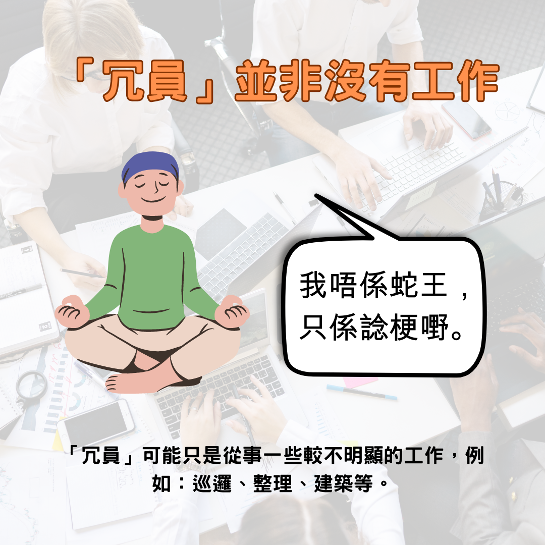 綜合唔同研究,發現唔只螞蟻,其實群居嘅昆蟲,包括蜜蜂、黃蜂同白蜂等等,都有超過一半嘅成員,係唔活躍嘅「冗員」。但亦有學者估計,呢啲「冗員」可能唔係真係冇嘢做,只係從事一啲較唔明顯嘅工作,例如:巡邏、整理或建築等等。佢哋都可能係好忙!只係唔係忙畀人睇![]()