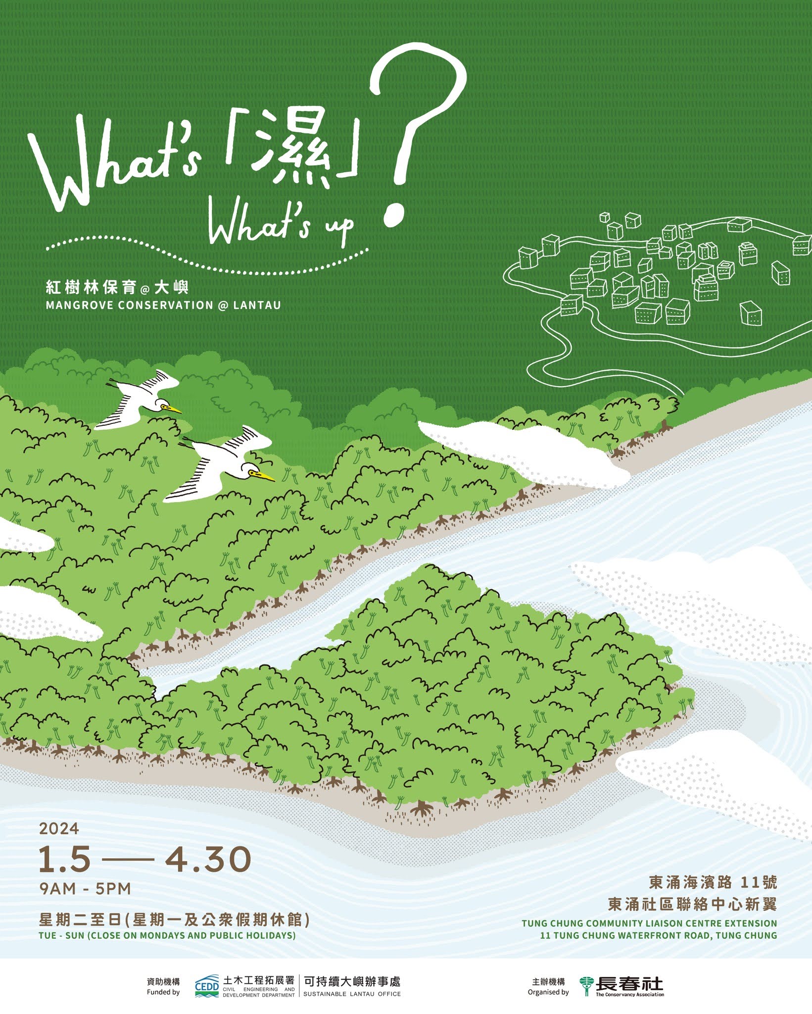 紅樹林是多種海洋生物及鳥類重要的棲息覓食之所。受土木工程拓展署可持續大嶼辦事處委託,由長春社主辦的【What’s 「濕」? 紅樹林保育@大嶼】展覽中,就介紹了好幾個賞「樹」好去處,展覽以有趣互動的形式設置,講解有關紅樹林的生態系統及現正面臨的威脅。除展覽外,還設有紅樹天然染色糊染體驗和彩繪海玻璃頸鏈工作坊,富教育意義,適合任何年齡人士參與。