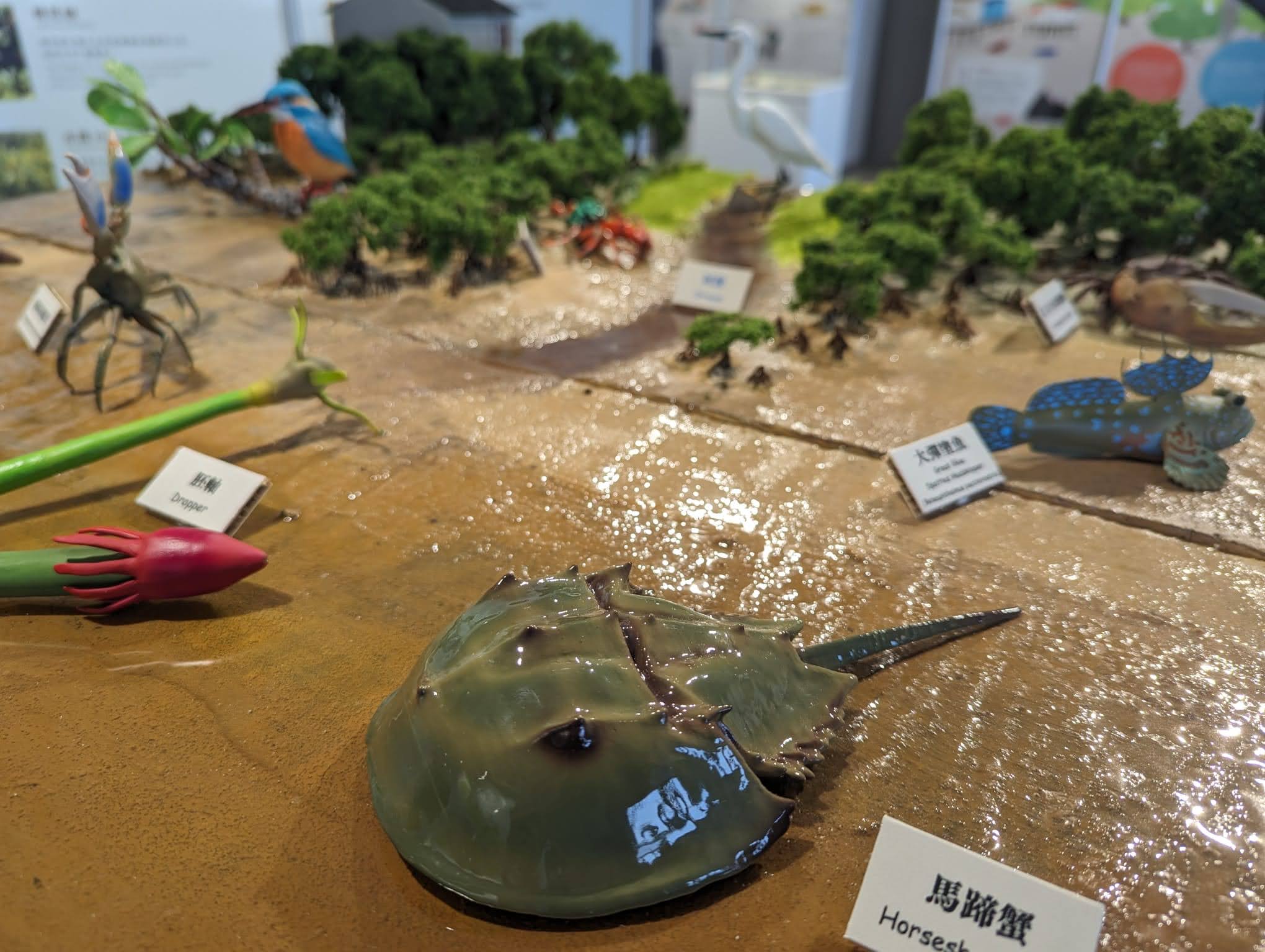 在展覽的正中央,展示了一大型立體透視模型,上面展有多種紅樹林常見的生物,如小白鷺、馬蹄蟹、大彈塗魚、普通翠鳥、角眼切腹蟹及亞洲小塔螺等,色彩鮮麗奪目,栩栩如生。旁邊亦有不同展覽品,介紹不同紅樹品種、各種螺類及海洋垃圾的種類等。參觀展覽後,公眾也可以下載e-sticker 在通訊軟件中使用,向親友推廣保護紅樹林的訊息。