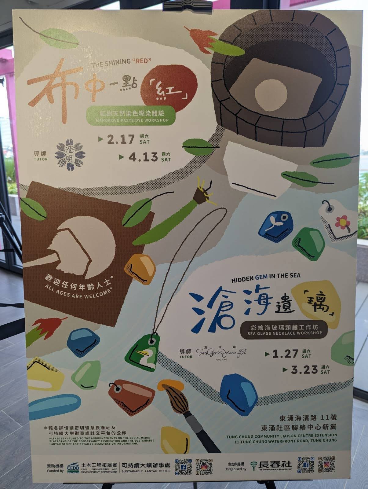 於展覽期內舉辦的紅樹天然染色糊染體驗,運用紅樹的落葉作天然染料,透過活動加深參加者認識紅樹林的生態系統服務和與人類的關係;至於彩繪海玻璃頸鏈工作坊,則是利用海岸淨灘得來的玻璃碎片。參加者可運用創意自由創作,令經過自然界打磨而成的光滑玻璃碎片重生,同時認識海洋垃圾議題。