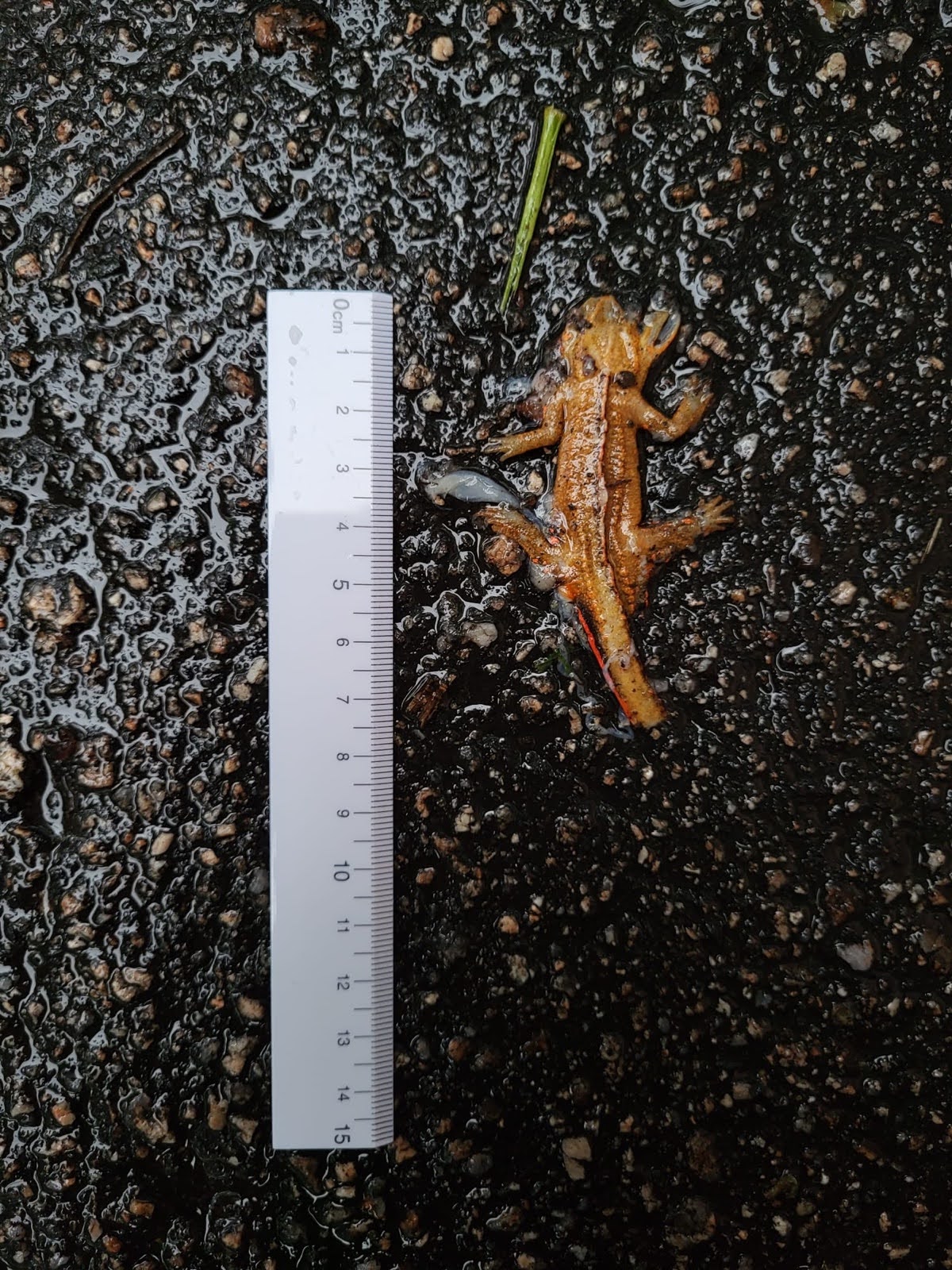 香港瘰螈受《野生動物保護條例》保護,在《國際自然保護聯盟瀕危物種紅色名錄》中被評為「近危物種」,代表將來有瀕危或滅絕的危機。香港瘰螈體內含有河豚毒素,其腹部上的橙色斑點是警告色,以警示捕獵者。牠們在香港幾乎沒有天敵,壽命可達十數年,生命卻因城市發展受威脅。剛過去的清明節,記者隨策展人馮漢城(阿城)及嶺南大學科學教研組助理教授劉彥芹博士,一行十數人沿着飛鵝山道漫步上山考察,親眼見證香港瘰螈的葬身處。考察當日,飛鵝山道車道繁忙,不時出現人車爭路的情況,由山腳到山腰,短短一公里路程已發現十多隻小動物被車輛碾斃,其中三隻是香港瘰螈。被路殺的野生動物中,除香港瘰螈外,還有變色樹蜥、黑眶蟾蜍、長尾南蜥及橫紋鈍頭蛇等。有記者問道,牠們為甚麼會在此處橫過馬路?劉博士解釋:「主要係條馬路穿過咗佢哋(野生動物)嘅棲息地。」阿城形容,這是季節性的路殺現象。每年三、四月是香港瘰螈遷徙的高峰期,遷徙季節的瘰螈特別活躍,因橫過馬路而被路殺的個案也特別多。清明節過後的週末下着大雨,劉博士的路殺科學研究團隊於4月6日再度上山調查,在潮濕的天氣下,發現在同樣路段,被路殺的香港瘰螈數量大增,有超過六十尾瘰螈被碾平。