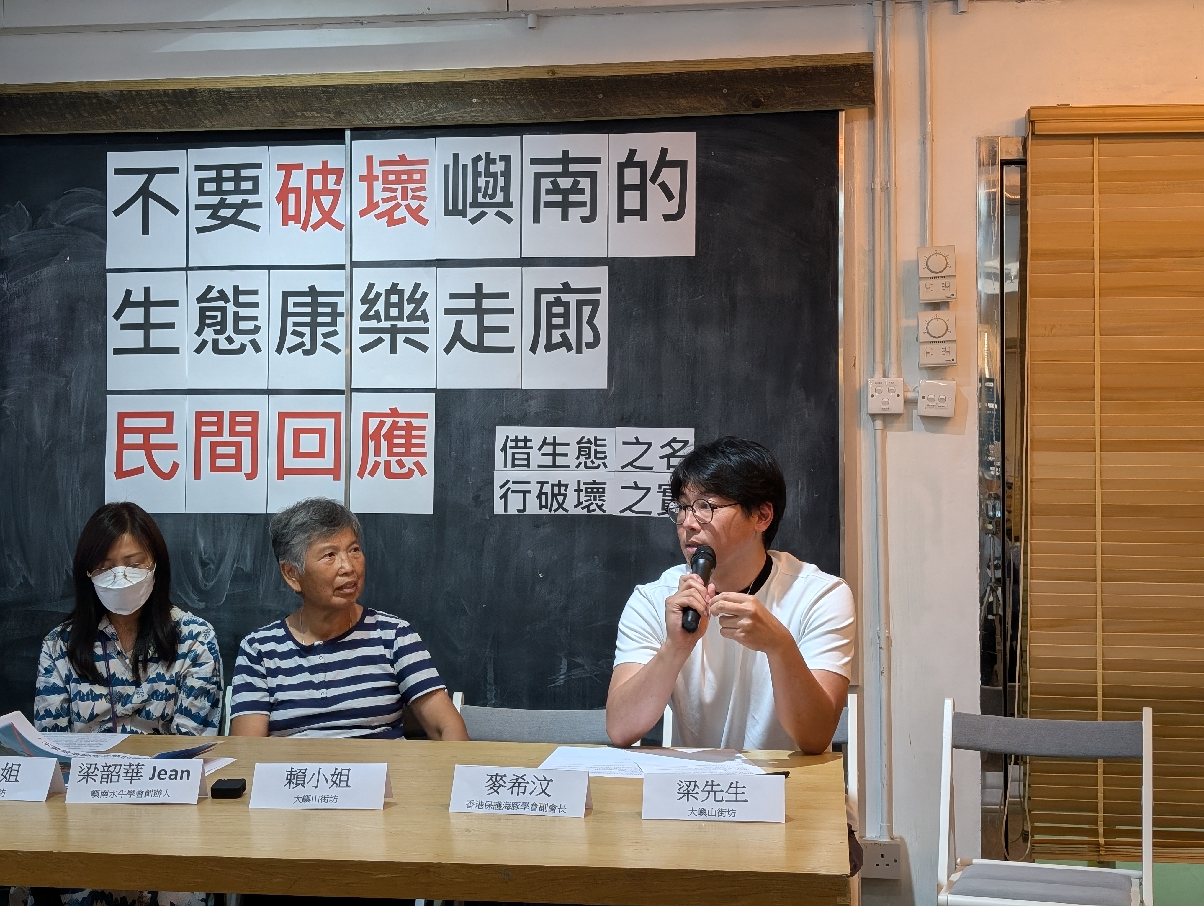 發展局土木工程拓展署現正就「南大嶼生態康樂走廊」以問卷形式進行公眾咨詢,至7月28日結束。計劃涵蓋長沙、水口、石壁和貝澳,興建歷奇設施、登山吊椅及優質度假住宿等,守護大嶼聯盟、嶼南水牛學會、香港海豚保育學會與三名大嶼山居民,於本月24日發起記者招待會,團體批評計劃是消費生態的「樂園兼打卡式」旅遊,為生態環境帶來「軟破壞」,與「南保育」的規劃原則背道而馳,是「借生態之名行破壞為實」,令大嶼山失去原有特色與優勢,更指出發展局所設的公眾咨詢問卷有既定立場,誤導公眾。
