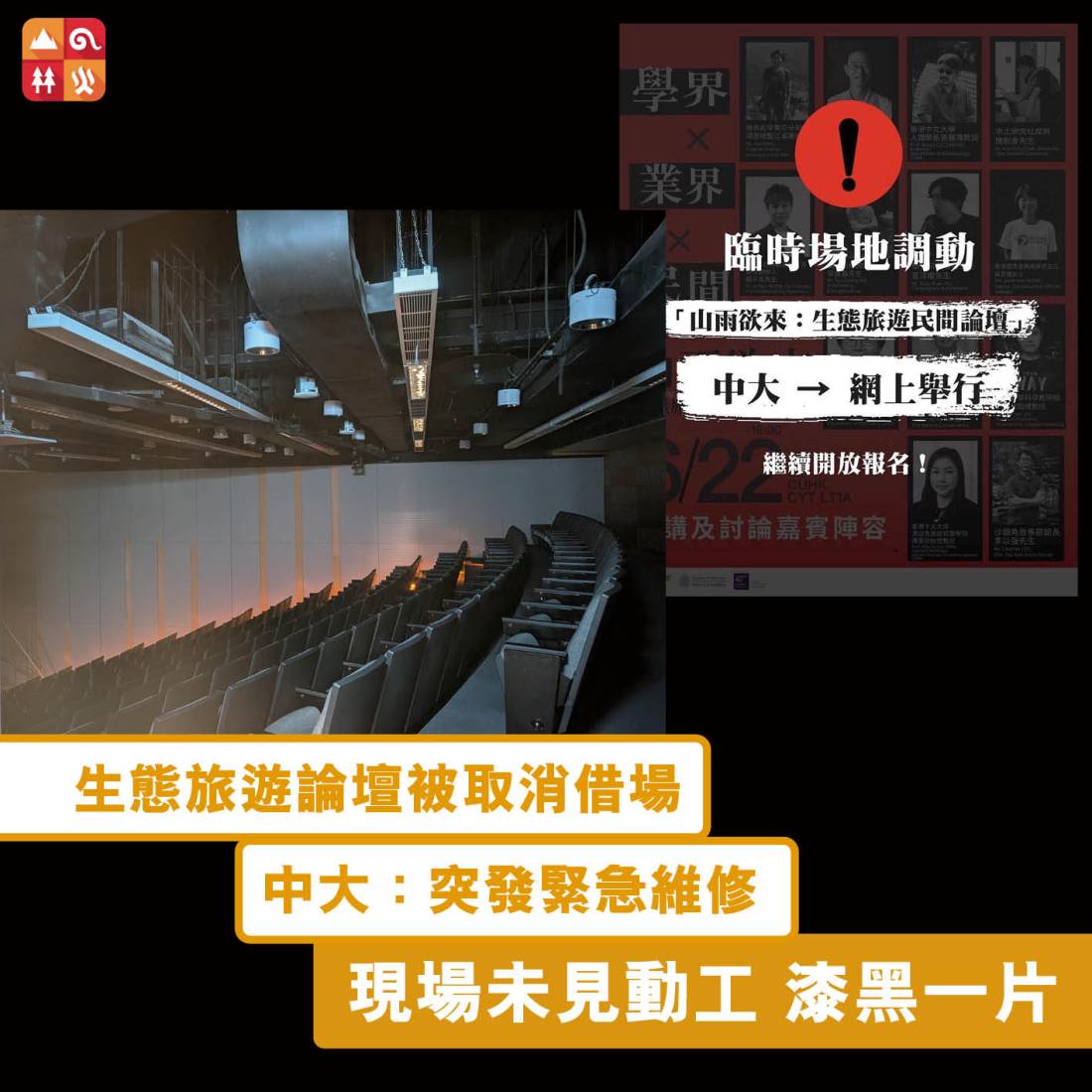 綠色和平原定今日(22日)於香港中文大學舉行的「山雨欲來:生態旅遊民間論壇」,昨日(21日)獲通知因場地突發需要緊急維修,活動改為線上進行。記者就維修去信中文大學查詢,回覆指:「由於場地進行緊急維修,已經通知主辦單位有關安排。對活動造成影響,校方致以歉意,敬請原諒。」至活動開始前,共收到逾500人報名。論壇的線上參加人數上半場高峰期共366人;下半場則有279人。綠色和平項目主任夏淳權表示,線上活動令本來不能親身到場的人也能参與,「突破距離限制」。