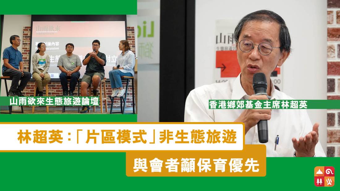 生態旅遊民間論壇於周日舉行,香港鄉郊基金主席林超英、本土研究社成員陳劍青、沙頭角故事館館長李以強、多個環保團體如香港觀鳥會及大自然保育協會亦有派員出席。林超英批評,政府以「片區模式」開發景點,是發展局的項目,而非旅遊項目,亦「睇唔到佢係以生態旅遊為主題嘅項目」。他以自身的旅遊經驗及近年在新界荔枝窩復村的工作為例,認為要發展生態旅遊,必須有社區參與,最重要是尊重村民。近年他開始在村中經營民宿,但因為村落承載力低,因此只定位為體驗式學習的教育基地,一直以來低調營運,入住率低,「唔收街客」,甚至表示特地抬高定價,是希望大眾遊客會「貴到唔想嚟」,以減少遊客對村民的影響。他指荔枝窩雖地方偏遠,但「交通唔方便都係賣點」,才顯得其矜貴。他認為,生態旅遊最重要是質量,讓旅客和在地經營者,在旅遊活動後都有所得益,文化和自然生態才可以延續下去。因此,不能為了「搵快錢、搵大錢」發展生態文明旅遊。要搵錢必須動動腦筋,「但絕對唔係靠落石屎搵」,可以透過辨識高質素的客戶「搵高質素嘅錢」,他指,要做出特色,可參考「詐騙集團手法賣故事」,他分享,最近有一家三口豪花萬多元只為了在荔枝窩食一頓午餐,他笑問:「呢啲錢係咪最抵搵呀?」