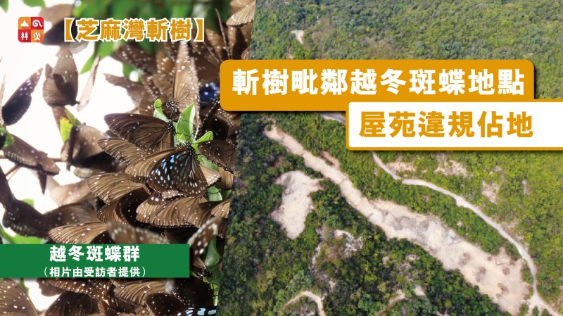 【芝麻灣斬樹】毗鄰越冬斑蝶地點 屋苑違規佔地 By: 風火山林 2022 年 07 月 04 日2022 年 07 月 05 日 生態生態、發展、綠色力量、芝麻灣、蝴蝶、大嶼山、斬樹 本刊於2021年中報道有關芝麻灣斬樹事件,得到公眾廣泛關注。至今年3月,有關注蝴蝶保育人士向本刊表示,芝麻灣斬… 深入閱讀